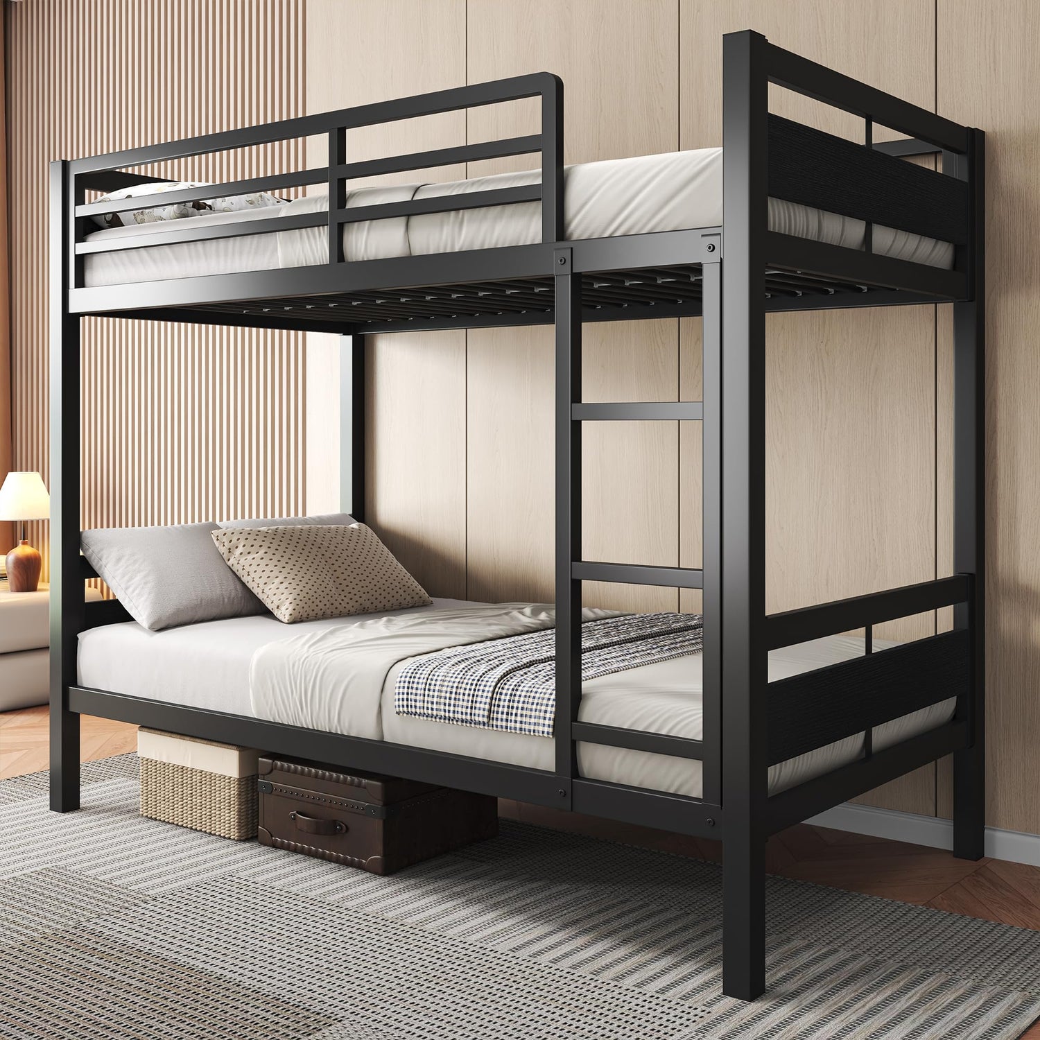 Feonase Metal Twin Over Twin Bunk Bed with Ladder and High Guardrail, Heavy-Duty Metal Slats Support, Noise Free, No Box Spring Needed, for Kids and Juniors, Black