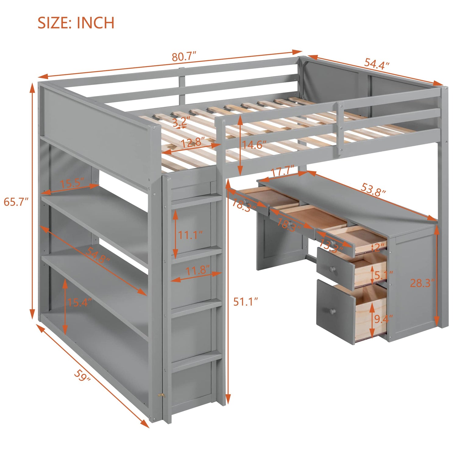 Full Loft Bed with Desk and Storage Bookcase Shelves,Solid Wood Loft Bed Frame with Storage Drawers and Built-in Ladders,Muti-functional High Loft Bed for Kids Boys Girls Teens(Grey)
