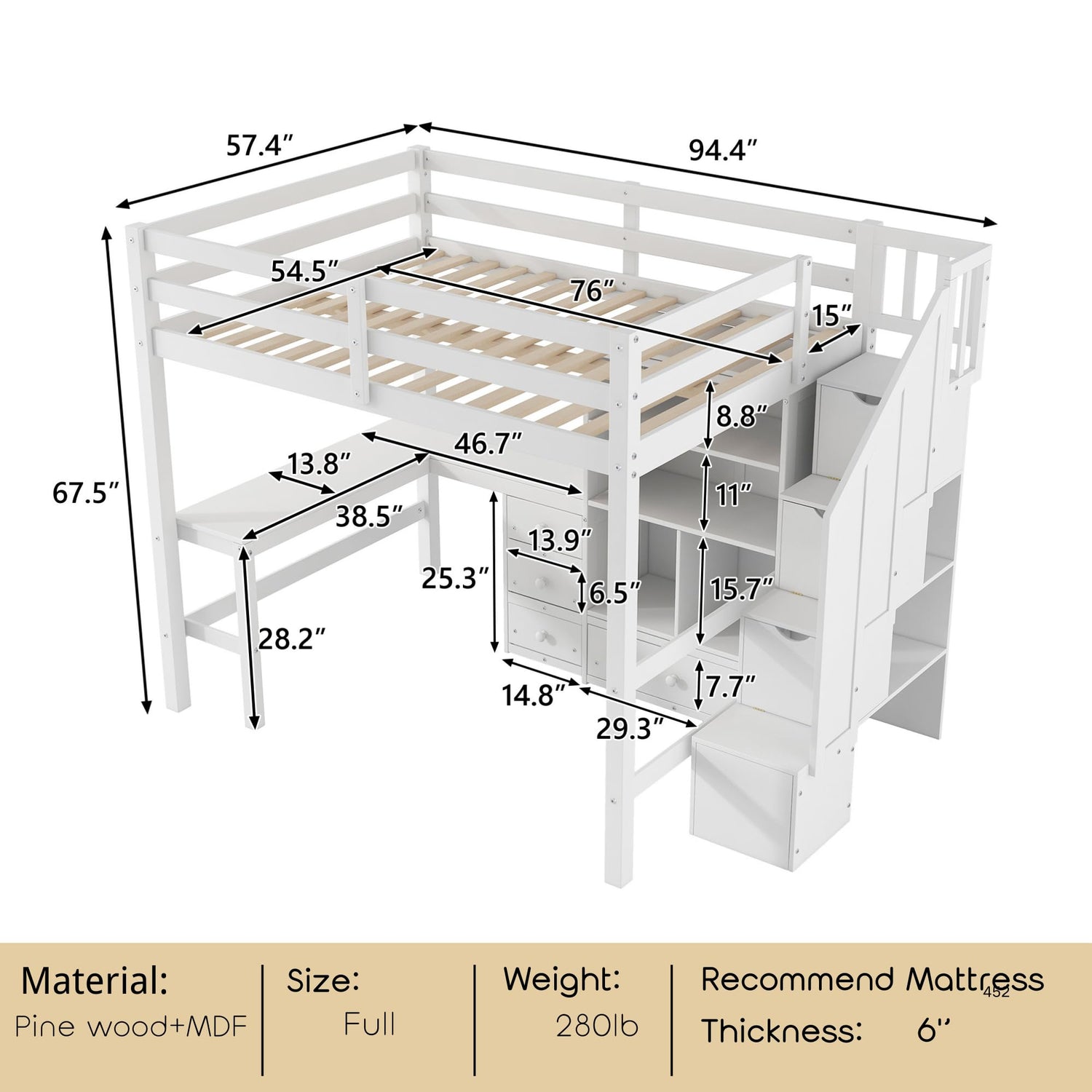 Full Size Loft Bed with Desk and Stairs Wood Loft Beds with Storage Cabinet and Bookcase High Loft Bed Frame with Staircase Shelves for Kids, Teen, Boys, Girls, White