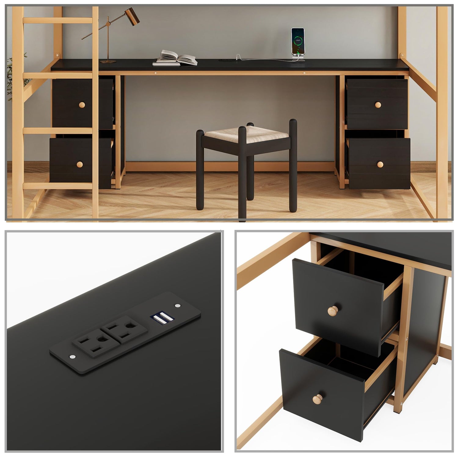 - Full Size Loft Bed with Desk and Storage Drawers, Metal Loft Bed with Bookcase and Charging Station, Full Size Loft Bed Frame with Guardrail, Full Loft Bed for Kids, Gold Black Loft Bed Full