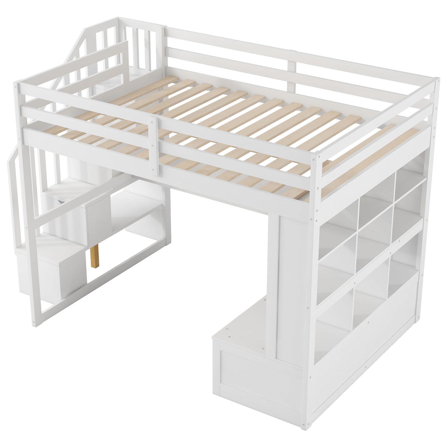 Full Size Loft Bed with Stairs and Desk, Wood Loft Beds Frame with Storage Drawers and Bookcase Shelves for Adults Teens Kids, White