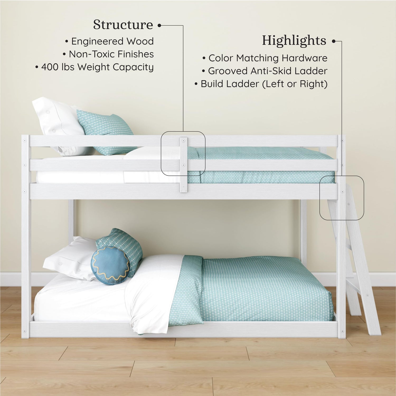 • Durable Build: Floor bunk bed is built with durable engineered wood and color-matched hardware to balance sturdy construction with sleek style. Each bunk has wooden slats and a metal support bar that contribute to a 400 lb. weight capacity per bed.