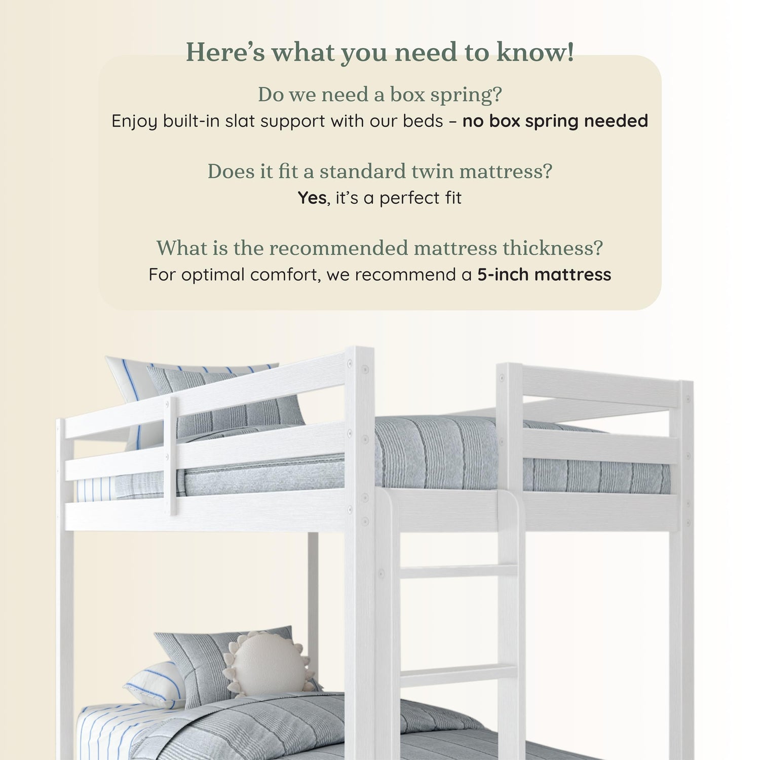 - Dimensions: Small bunk bed for small room measures 80.75” L x 42” W x 62.25” H. Wood bunk bed is compatible with standard twin-size mattresses between 5 and 8 inches thick.