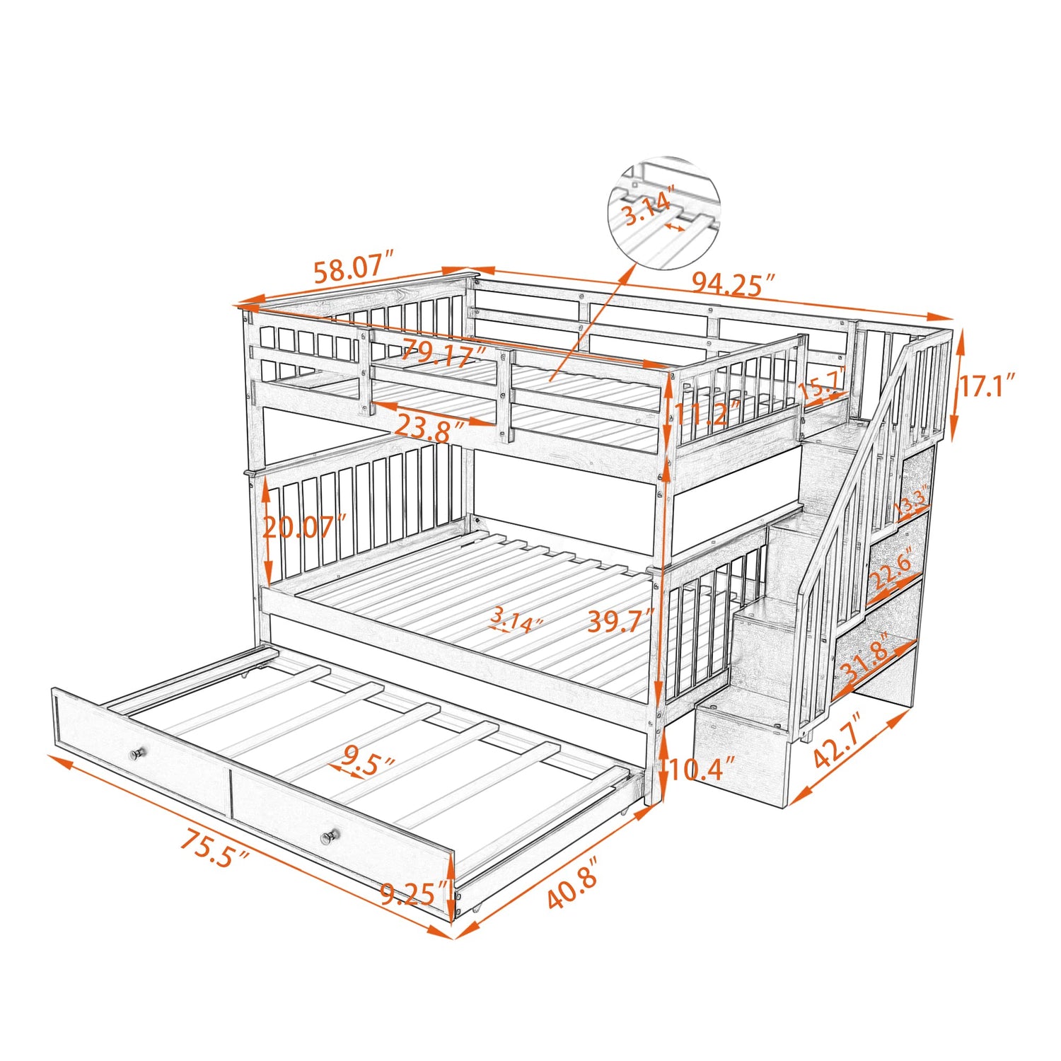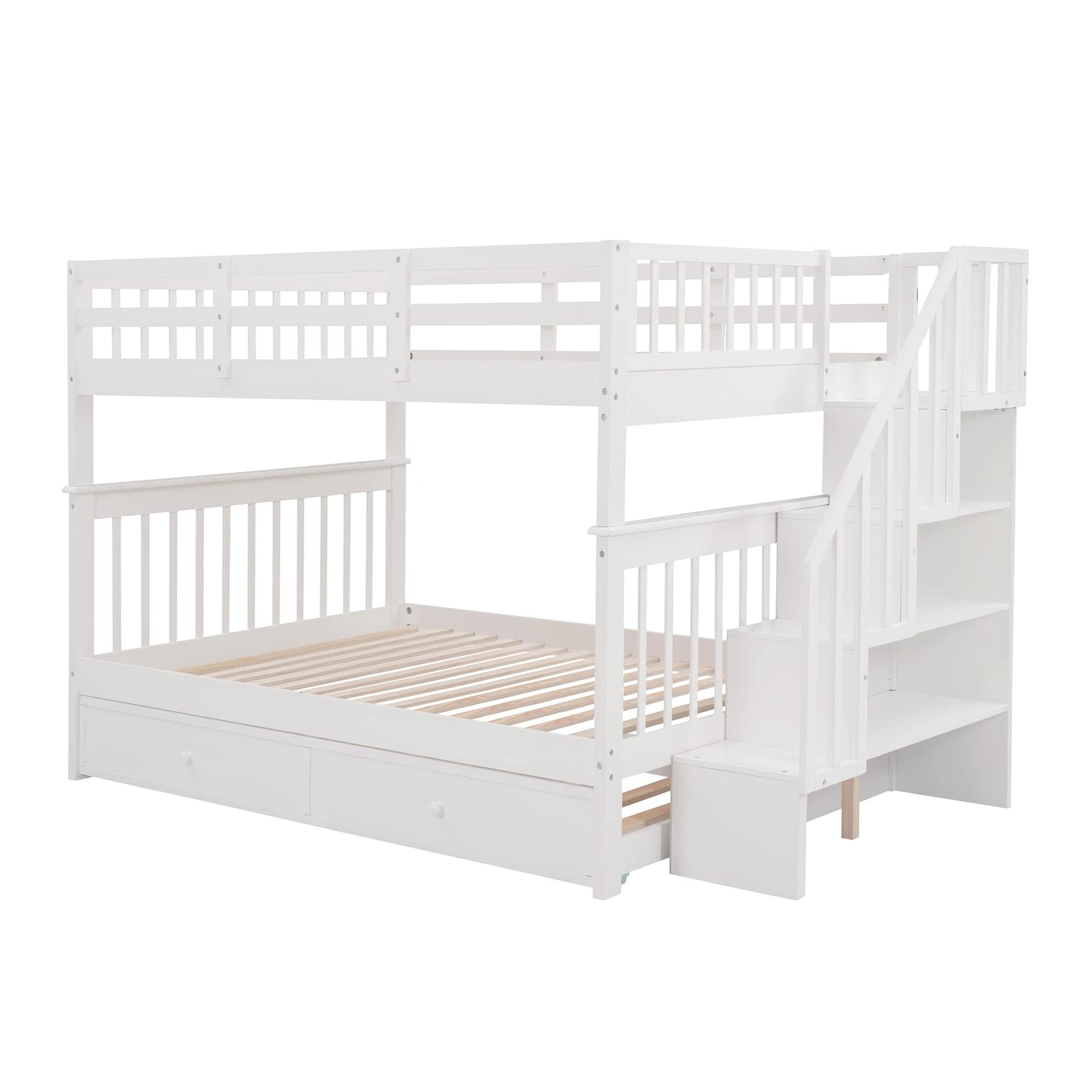 Harper & Bright Designs Full Over Full Bunk Beds with Twin Size Trundle and Stairs, Wood Bunk Bed with Storage Shelves and Guard Rail, Full Size Bunk Bed Frame for Kids, Teens, Adults (Full, White)