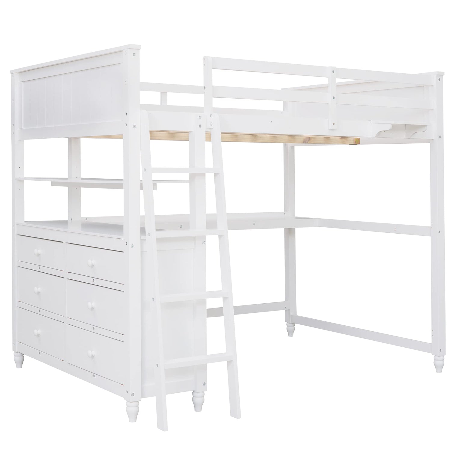 - [Multifunctional Loft Bed with Desk] - The space underneath the full size loft bed includes a desk, shelves and 6 large storage drawers ,which provided a good place for your kids to read, do homework or play and create their own world to be explored. Coming with one shelf, which helps to store books, display decorations.
