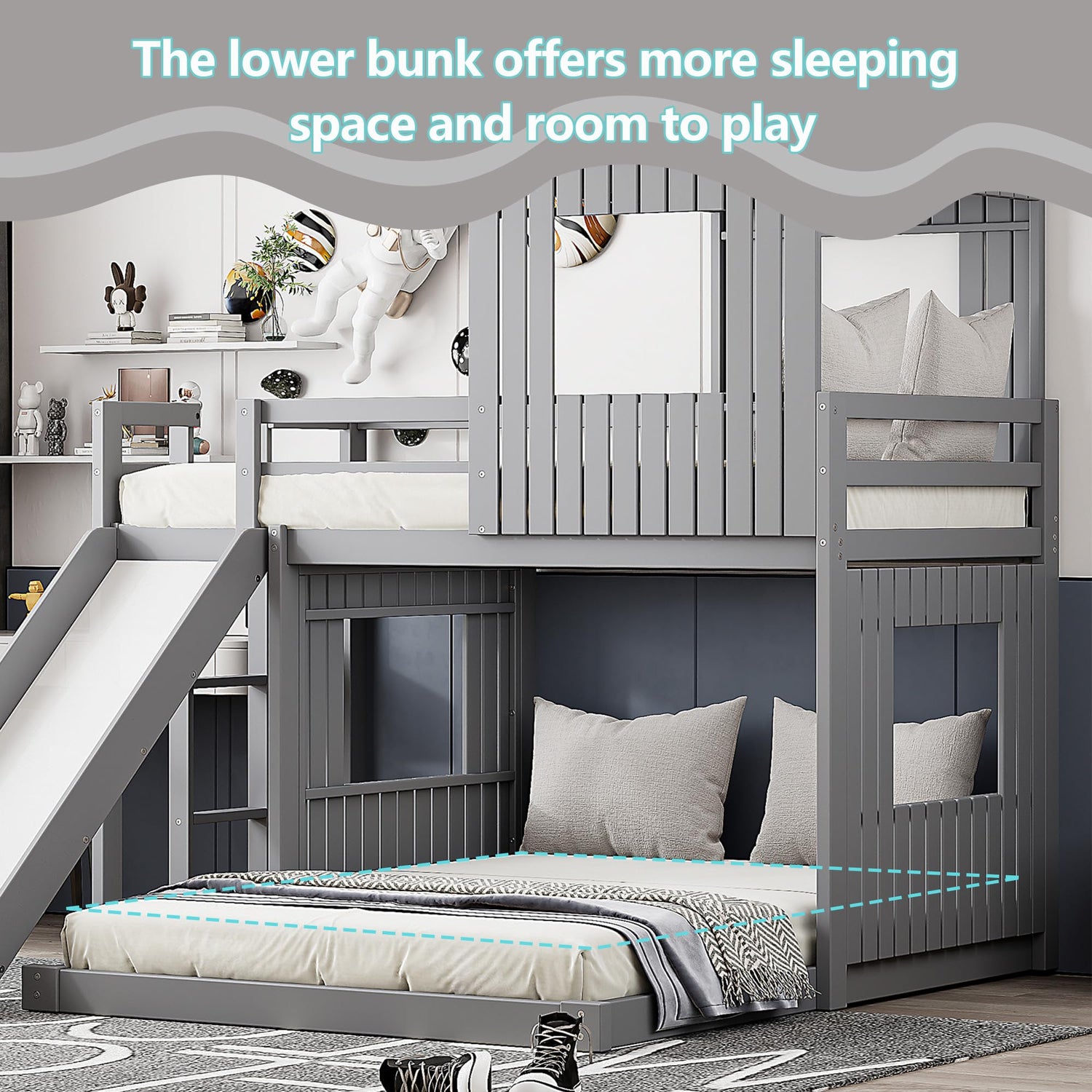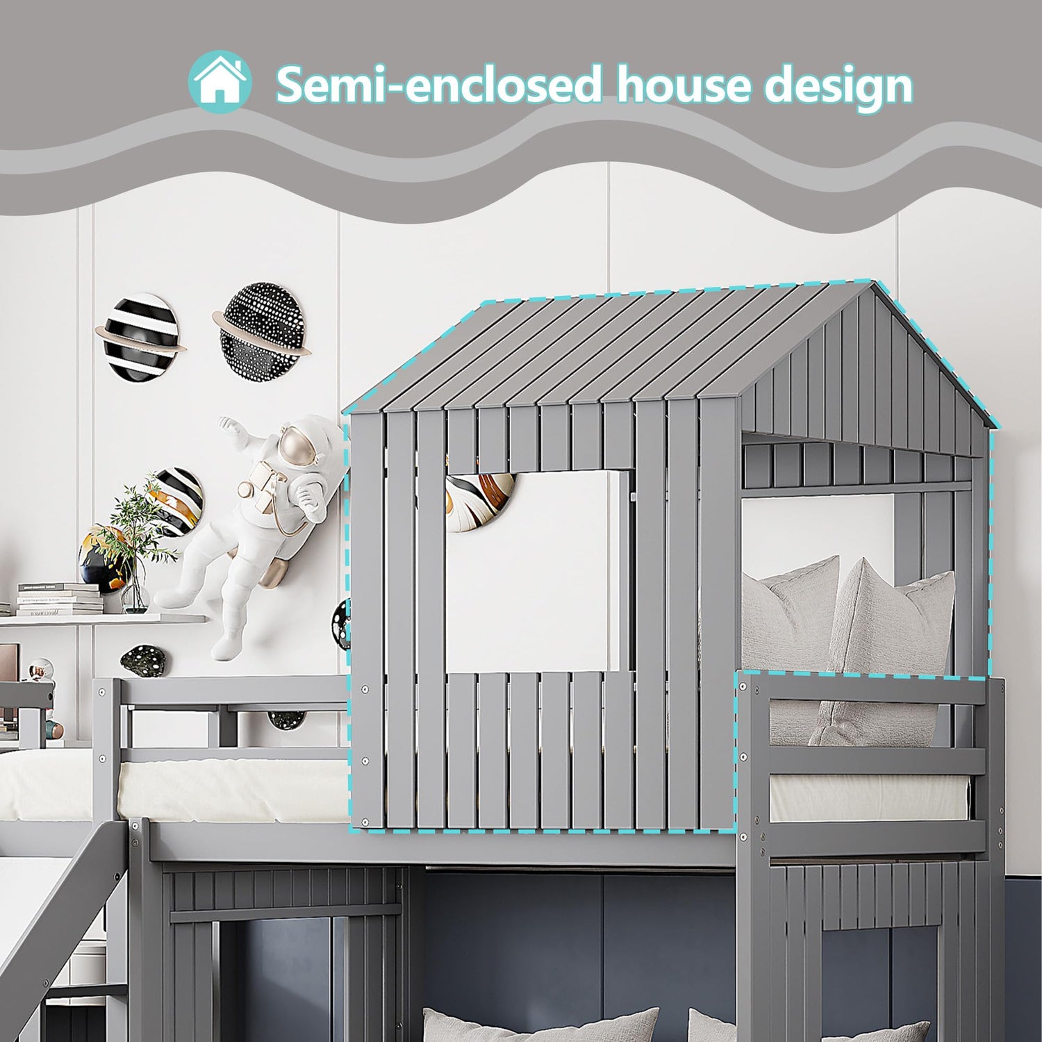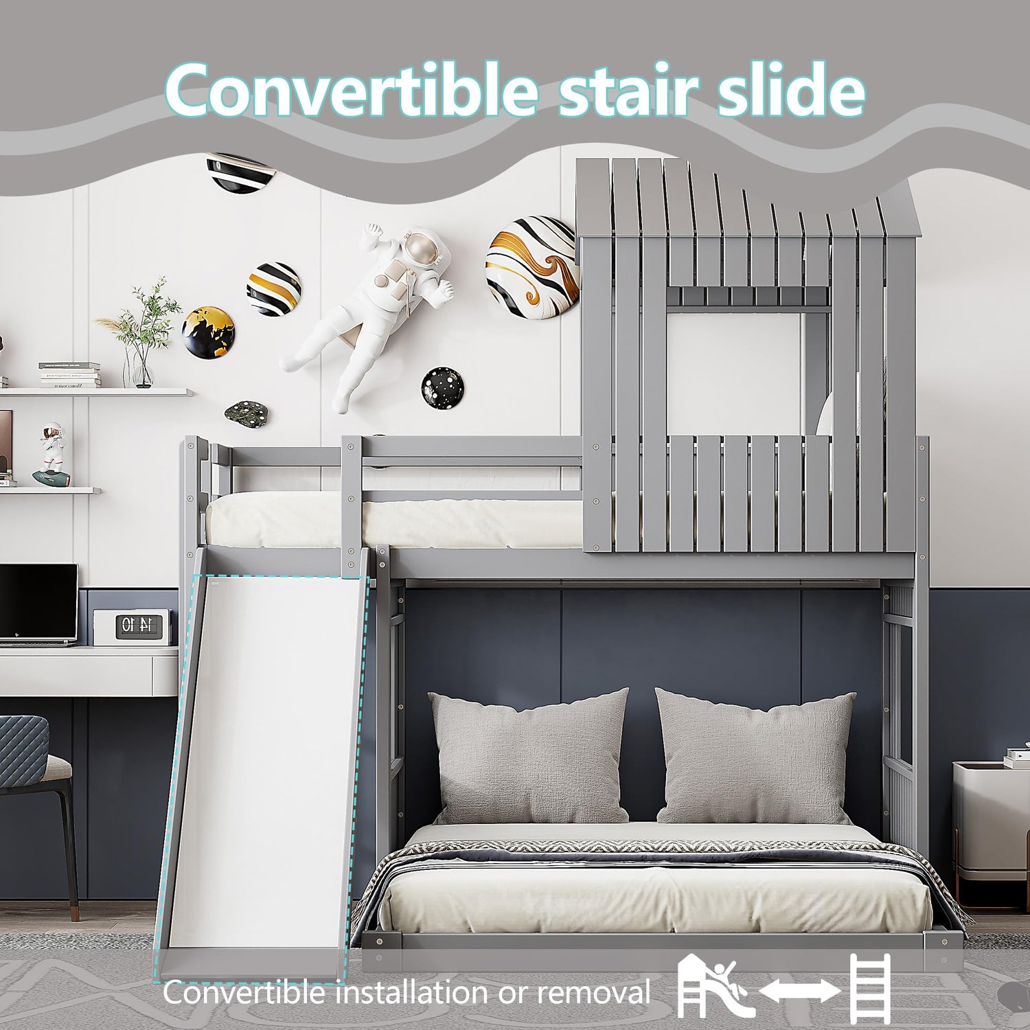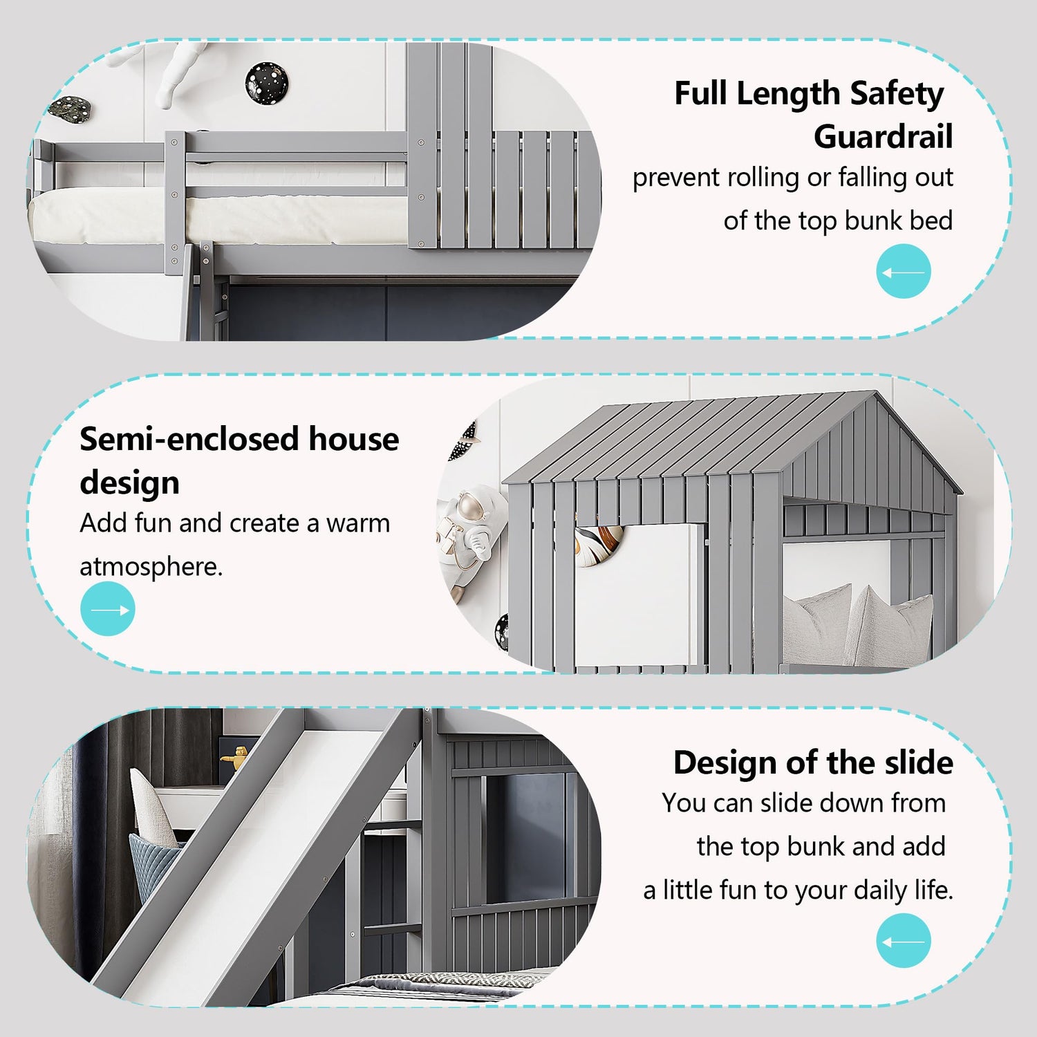 Harper & Bright Designs House Floor Bunk Beds with Slide, Wooden Twin Over Full Bunk Beds with Slide, Roof and Guard Rail for Kids, Teens, No Box Spring Needed (Gray, Twin Over Full Size)