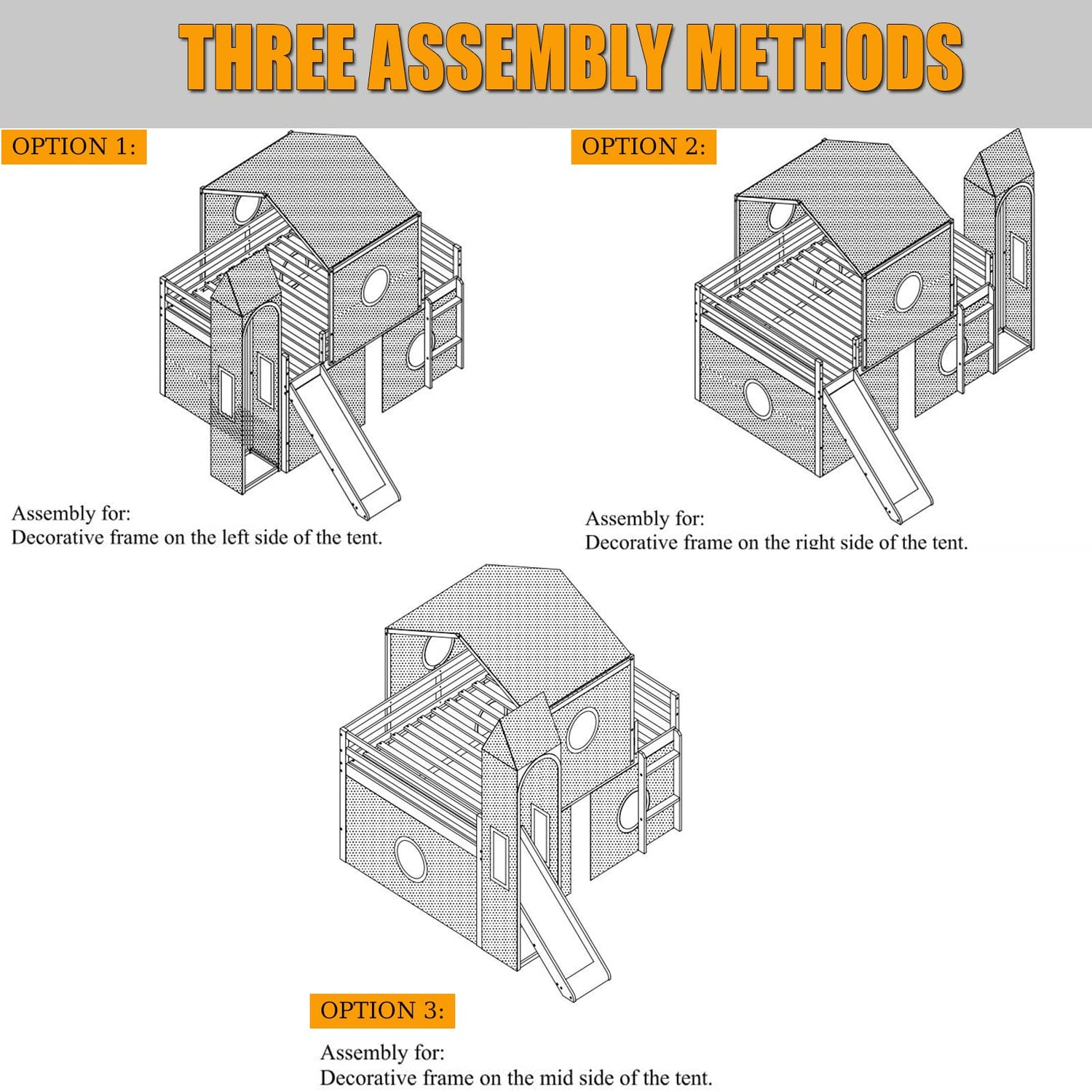 • 【Convertible Ladder and Slide】This twin loft bed with built-in ladder, easy to climb up and down from the upper bed. Featuring a smooth slide for your kids to play, add fun and develop sense of balance and coordination. and We provide 3 installation methods, the tower can be placed on the left side or the right side, or placed on the slide. Which you can chose most suitable way to matching your bedroom design.