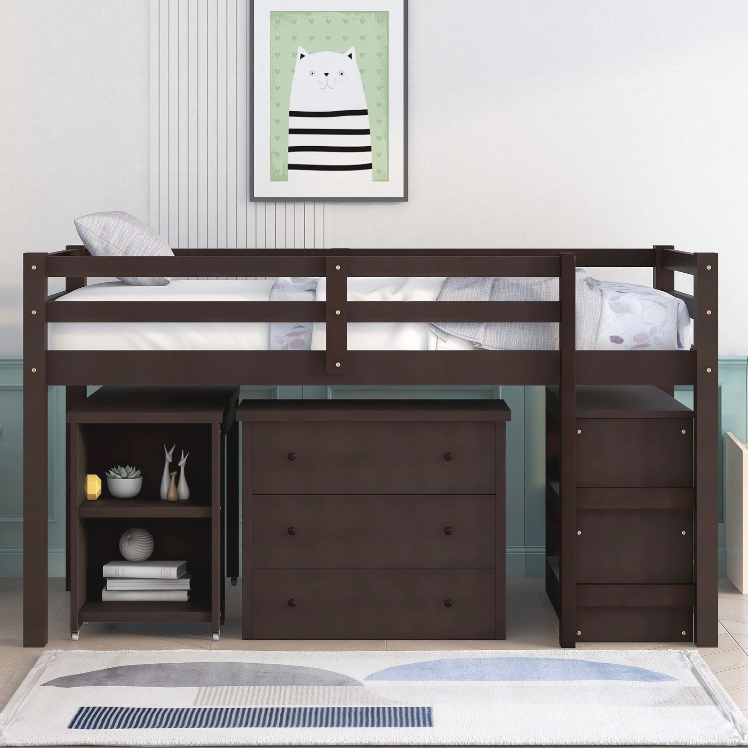 Harper & Bright Designs Kids Low Loft Bed with Rolling Desk and Storage Cabinet, Twin Size Wood Loft Bed Frame with Bookshelf (Espresso, Twin)
