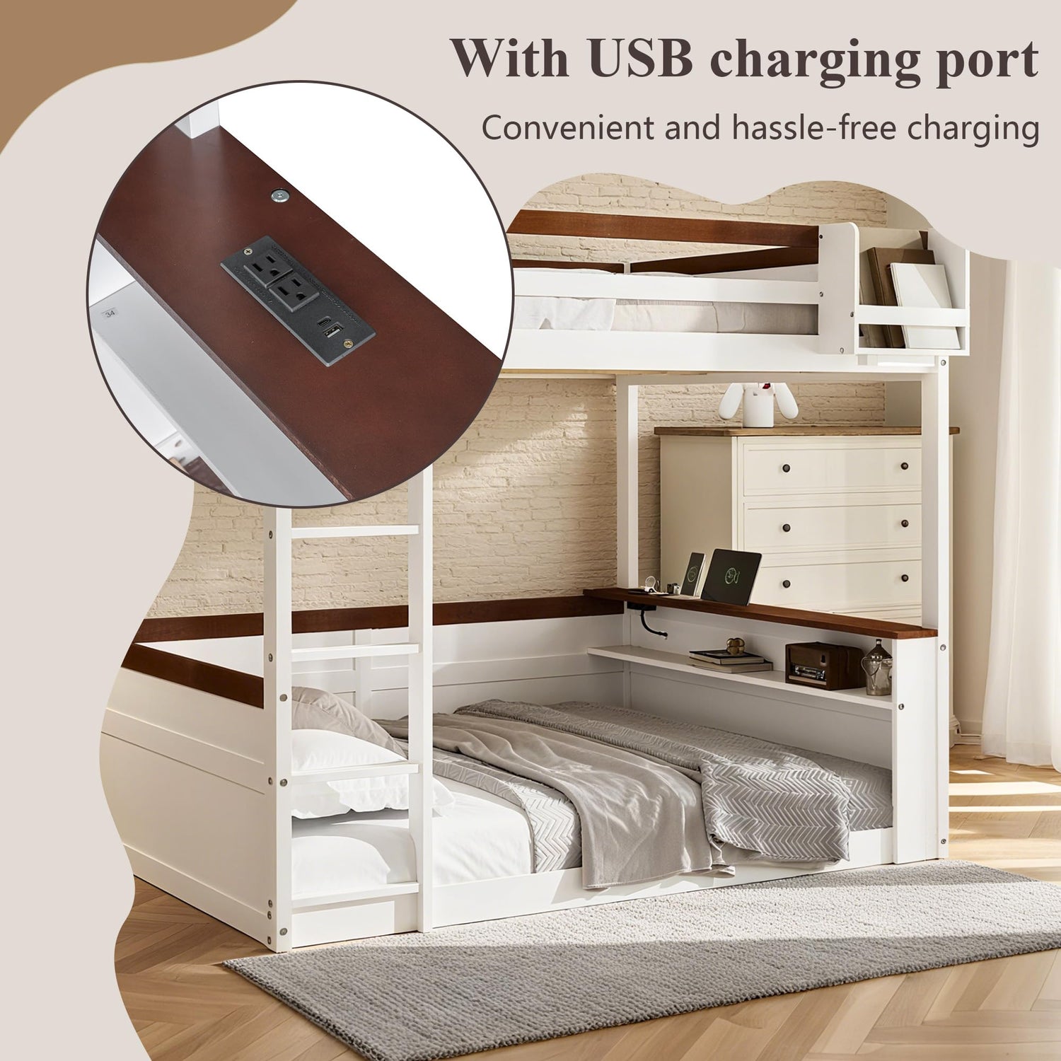 Harper & Bright Designs Low Bunk Bed with Storage Shelves, Wood Bunk Bed with USB Charging Station and LED Light, Queen Over Queen Bunk Beds for Adults, Kids, Teens, White