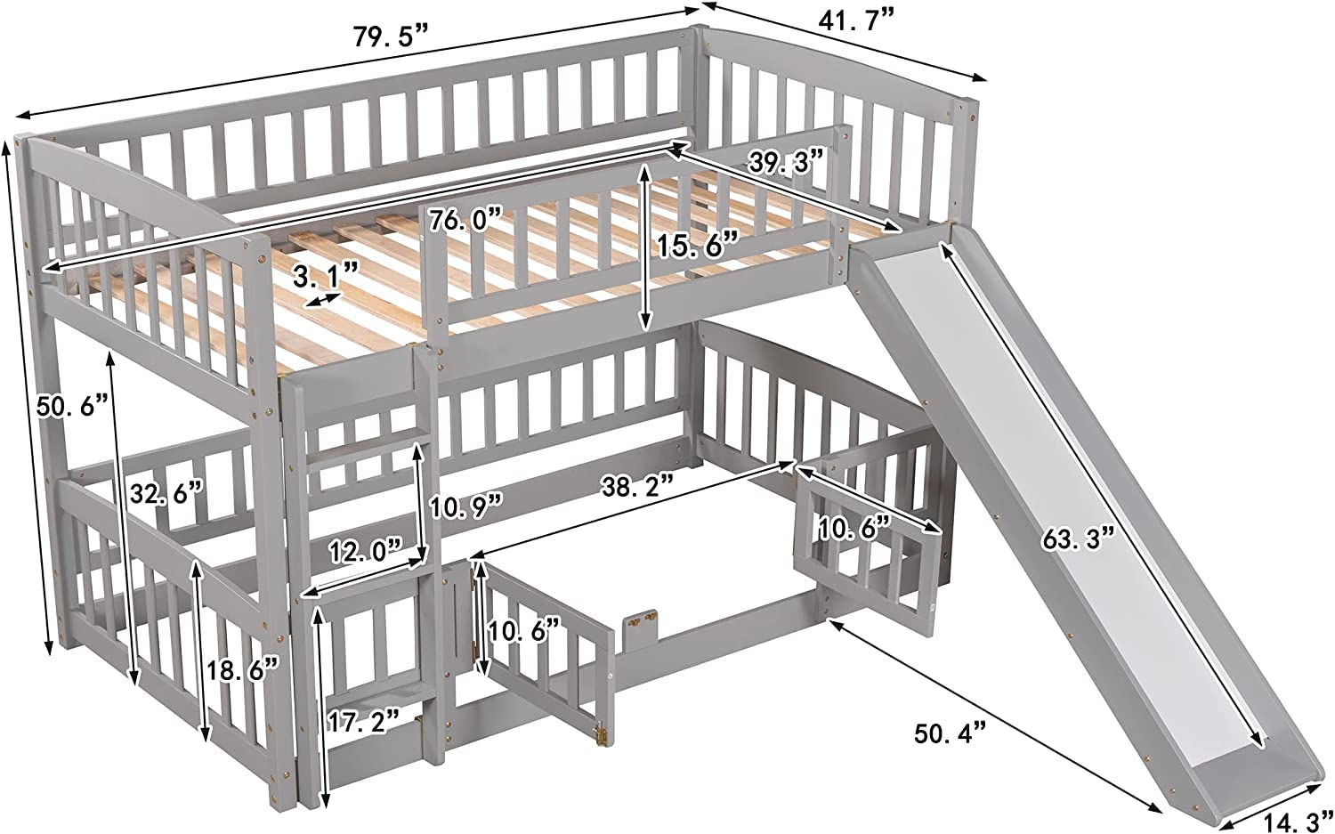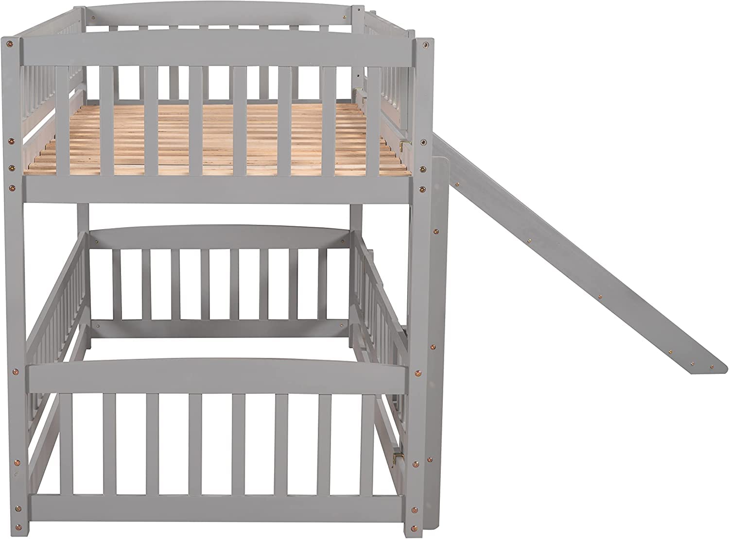 Harper & Bright Designs Low Bunk Beds Twin Over Twin, Kids Bunk Bed with Slide, Fence and Ladder, Wood Twin Bunk Beds for Girls Boys, Grey
