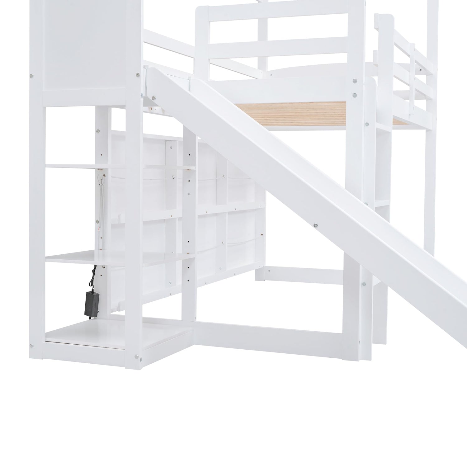 Harper & Bright Designs Twin House Loft Bed with Slide, Storage Shelves and Light, Wood Twin Bed Frame with Roof for Kids - White
