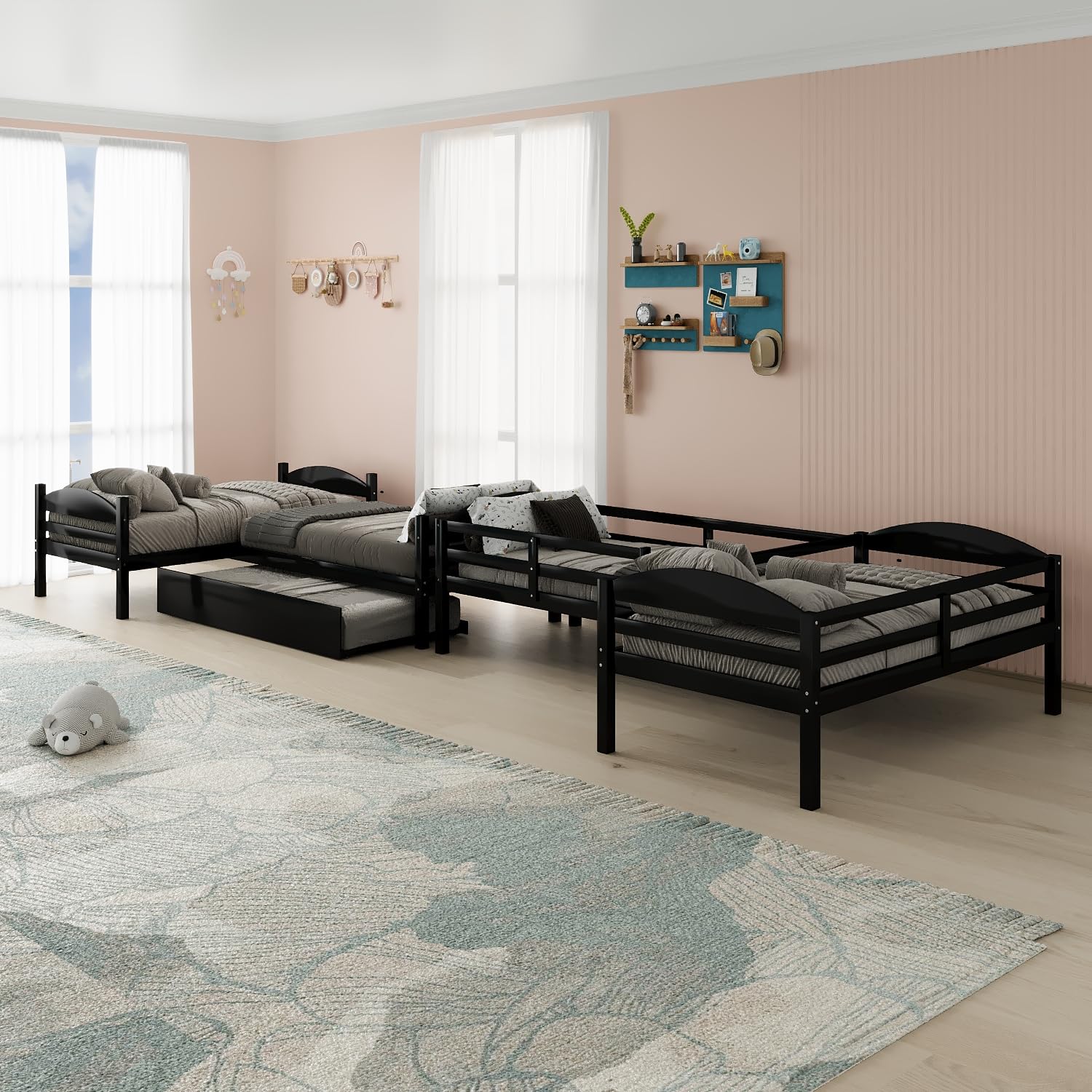 - 【L-Shaped Bunk Bed with Trundle】This Twin L-Shaped bunk bed features two twin size upper beds and two twin size bottom beds and one twin size trundle for accommodating your kids or any overnight sleepers. It can also be divided into two L-Shaped Beds for even more convenience, depending on how you want to organize your space. No spring box needed