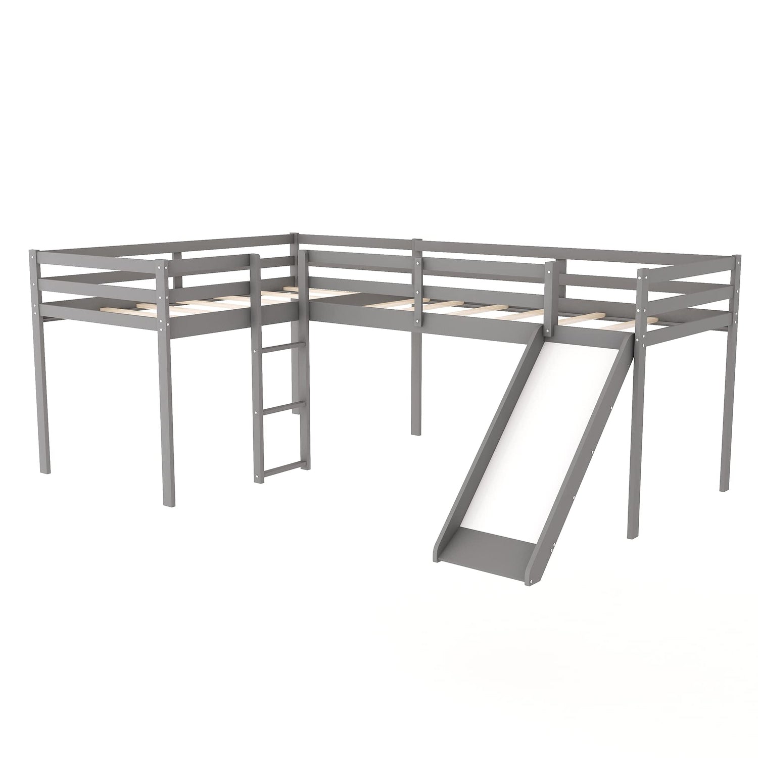 Harper & Bright Designs Twin Loft Bed for Kids, L-Shape Loft Beds with Slide, Low Loft Bed Frame Corner Bunk Bed for Kids, Wooden Loft Bed for Girls Boys Teens (New, Gray)