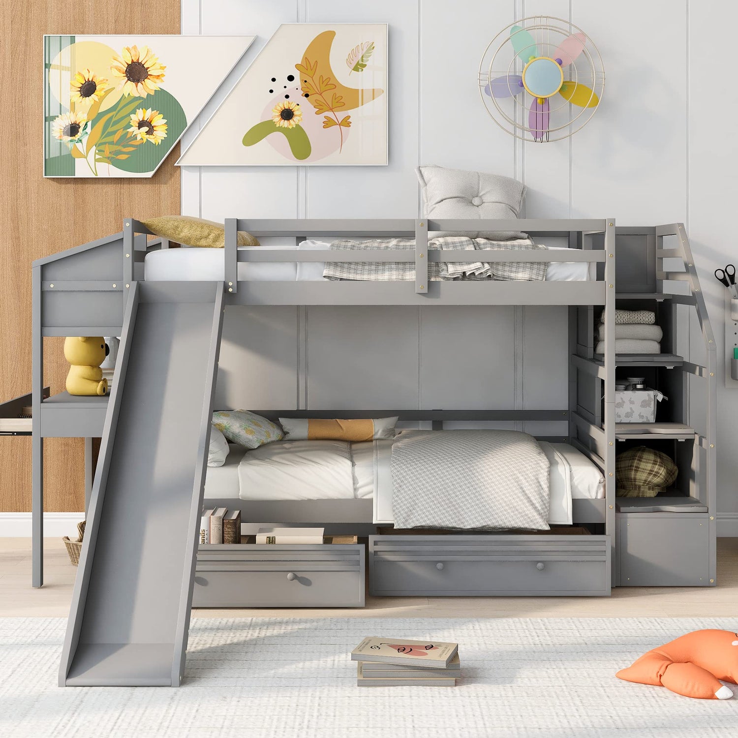 Harper & Bright Designs Twin Over Twin Bunk Bed with Stairs, Slide, Desk, Solid Wood Bunk Bed with Storage Drawers and Shelves, for Kids Teens Adults (Gray)