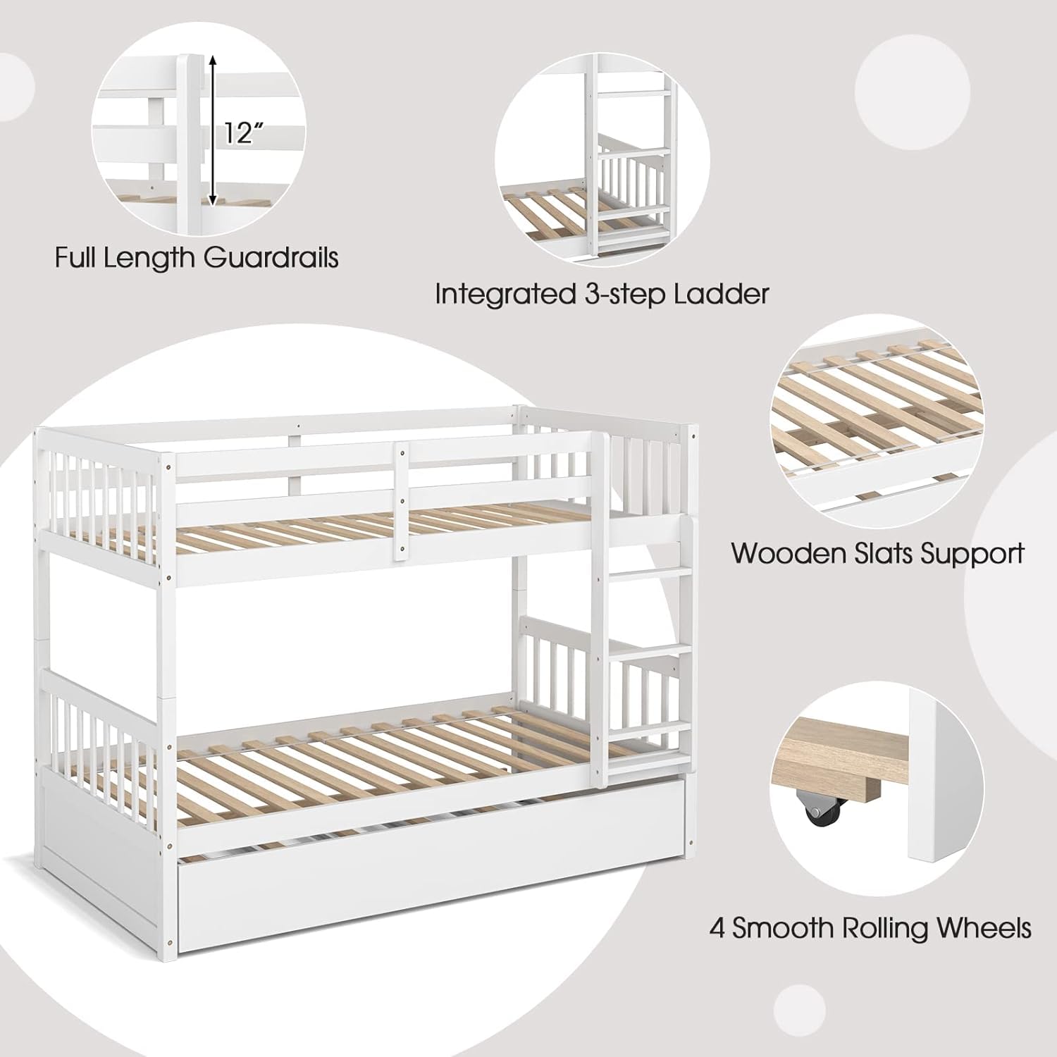 Thiswell-designed bunk bed is ideal for modern families looking to save space andcreate a versatile living area. The bunk bed is constructed with a high-qualitysolid wood frame, and the wood slats provide enhanced support to ensureload-bearing capacity, stability and durability. The bunk bed comes with a pull-outtrundle bed to provide guests with an additional sleeping area and efficientuse of space. Offering exceptional versatility, this convertible bunk bedconverts into two separate twin beds and a twin-sized trundle bed. Thetrundle's 4 smooth-rolling casters make pulling in and out easy. The 12-inchguardrails and integrated ladder provide your child with full protection whilesleeping.