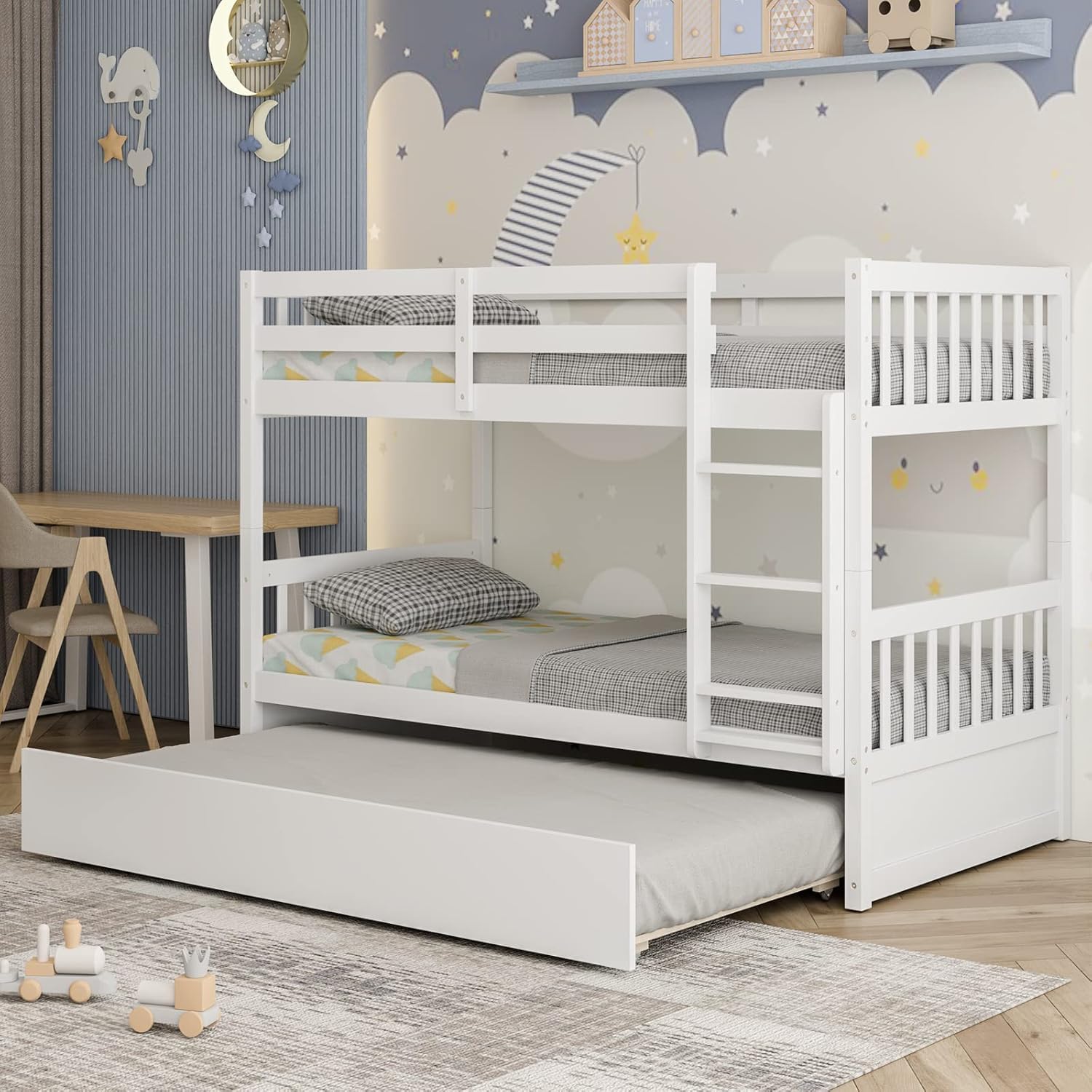 HOMGX Twin Over Twin Bunk Bed with Trundle, Wooden Removable Shelf Bunk Bed w/Ladder & Full Length Guardrail, Space-Saving Convertible Bunk Beds for Homes & Dorms (White)