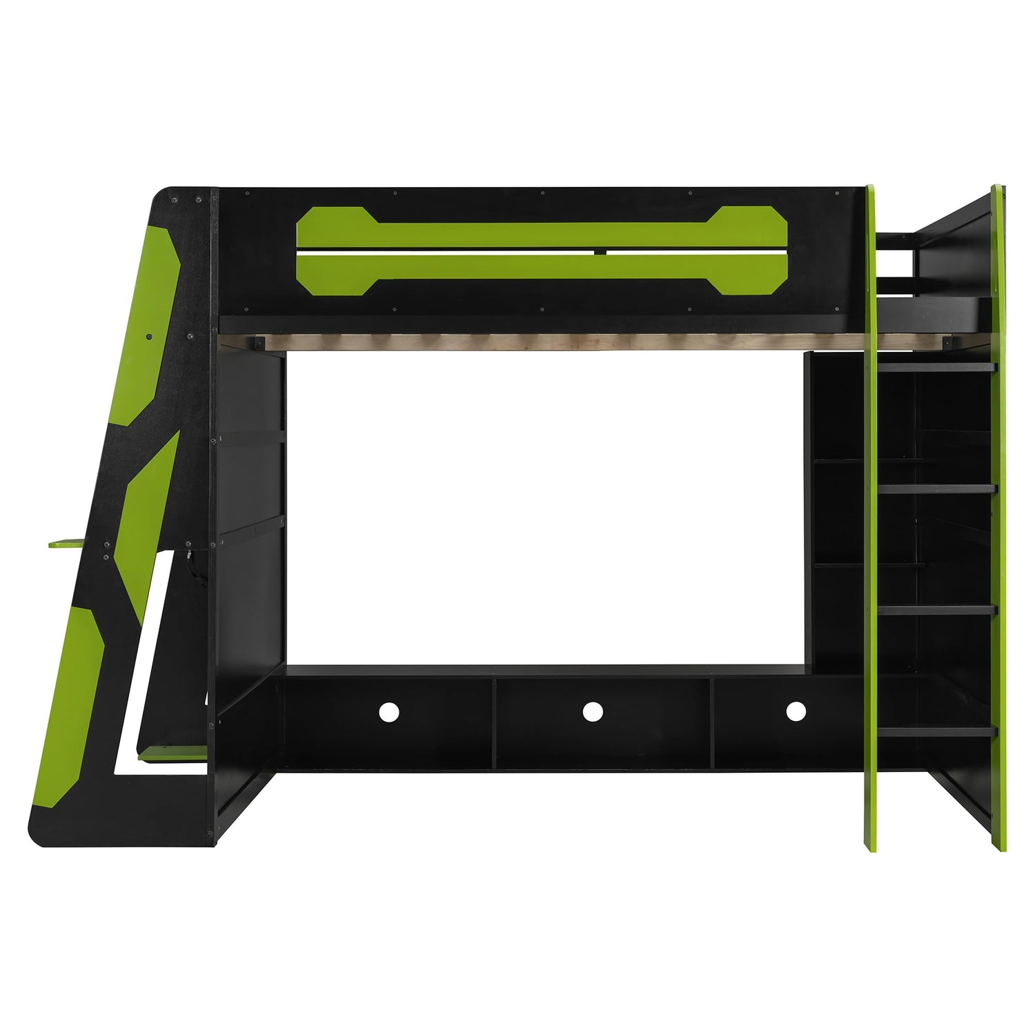 Details: ❤ This loft bed features a sturdy full-wood frame and a sleek esports color scheme, offering an all-in-one gaming and work space: a spacious under-bed compartment designed for TV and console storage lets you switch seamlessly between console gaming and movie watching; the integrated side desk accommodates a desktop PC and peripherals, with a dedicated console entertainment area beneath; a built-in RGB light strip installed under the desk creates an immersive esports atmosphere; and multi-tiered shelving keeps accessories, décor, and personal items neatly organized.
