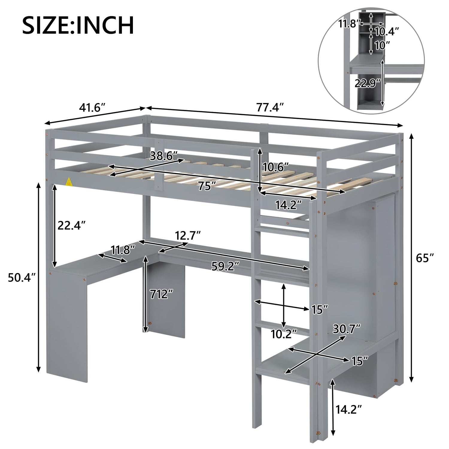Details: Sturdy Wood Bed Frame - Constructed with a sturdy wood frame and supported by 14 wooden slats, our loft bed frame offers superior stability. It can hold up to 250 lbs without the need for a box spring. The slats also prevent mattress sliding, ensuring a longer lifespan for your mattress