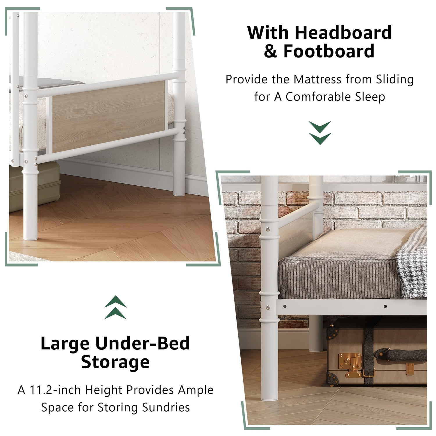 - MULTI-FUNCTIONAL STORAGE SOLUTIONS: This twin over twin bunk bed include a handy bedside storage bag for essentials like phones, books, glasses, chargers and remotes, as well as four hooks for hanging bags, scarves, hats and keys, making the top bunk even more practical. The 11.2-inch under-bed space provides ample room for suitcases or other large items, significantly expanding bedroom storage options and keeping the space organized