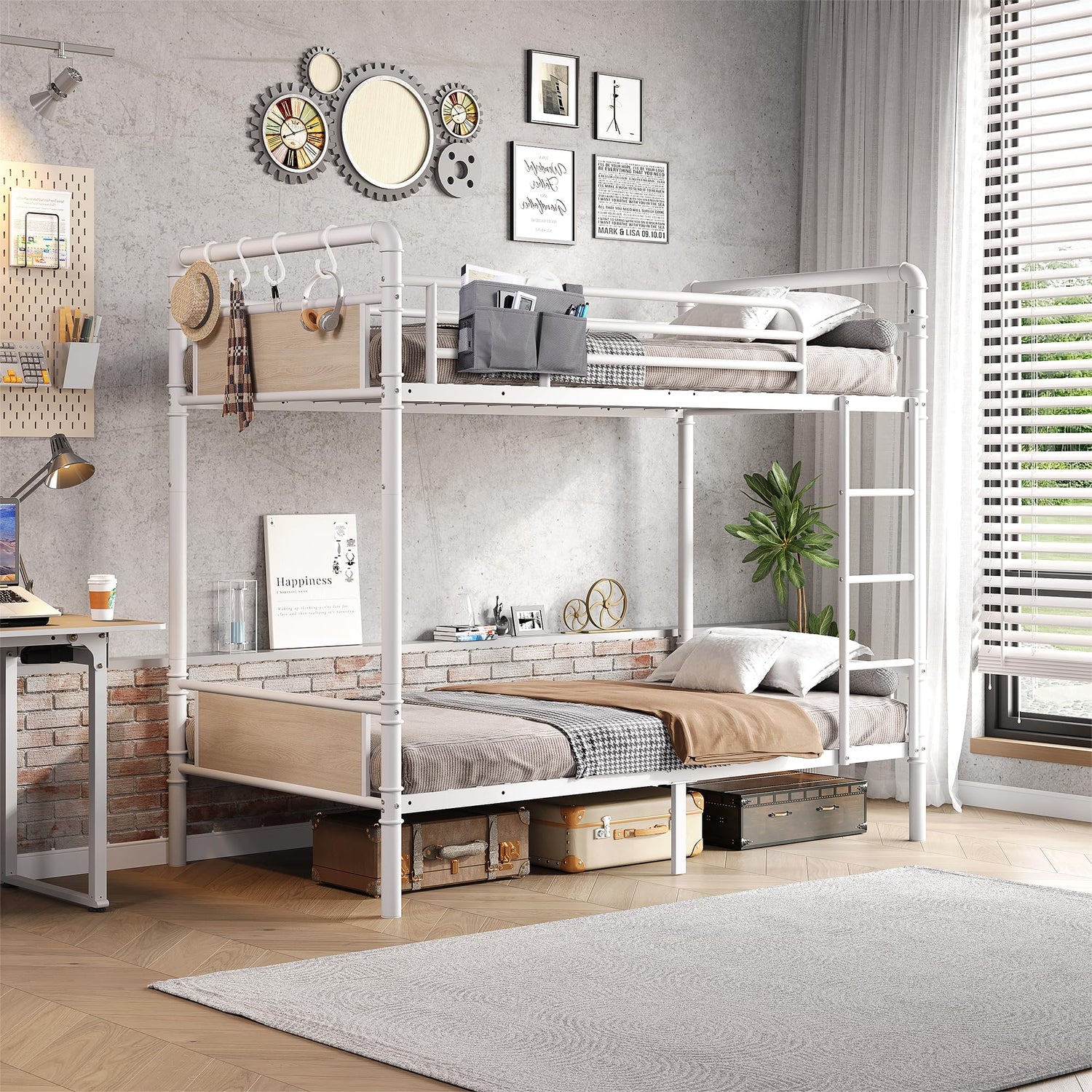 - AESTHETIC APPEAL AND UTILITY: Our Bunk beds are the epitome of practicality and elegance. Constructed with 1.5-inch thick white round metal tubes featuring elegant gold accents, not only visually appealing but are also sturdy and safer for kids without sharp edges like square tubes. The headboard and footboard are crafted with natural wood panels, adding a vintage industrial touch to the room. Together, these elements create a unique steampunk-inspired atmosphere, making this twin bunk bed a standout piece for kids, teens, or adults