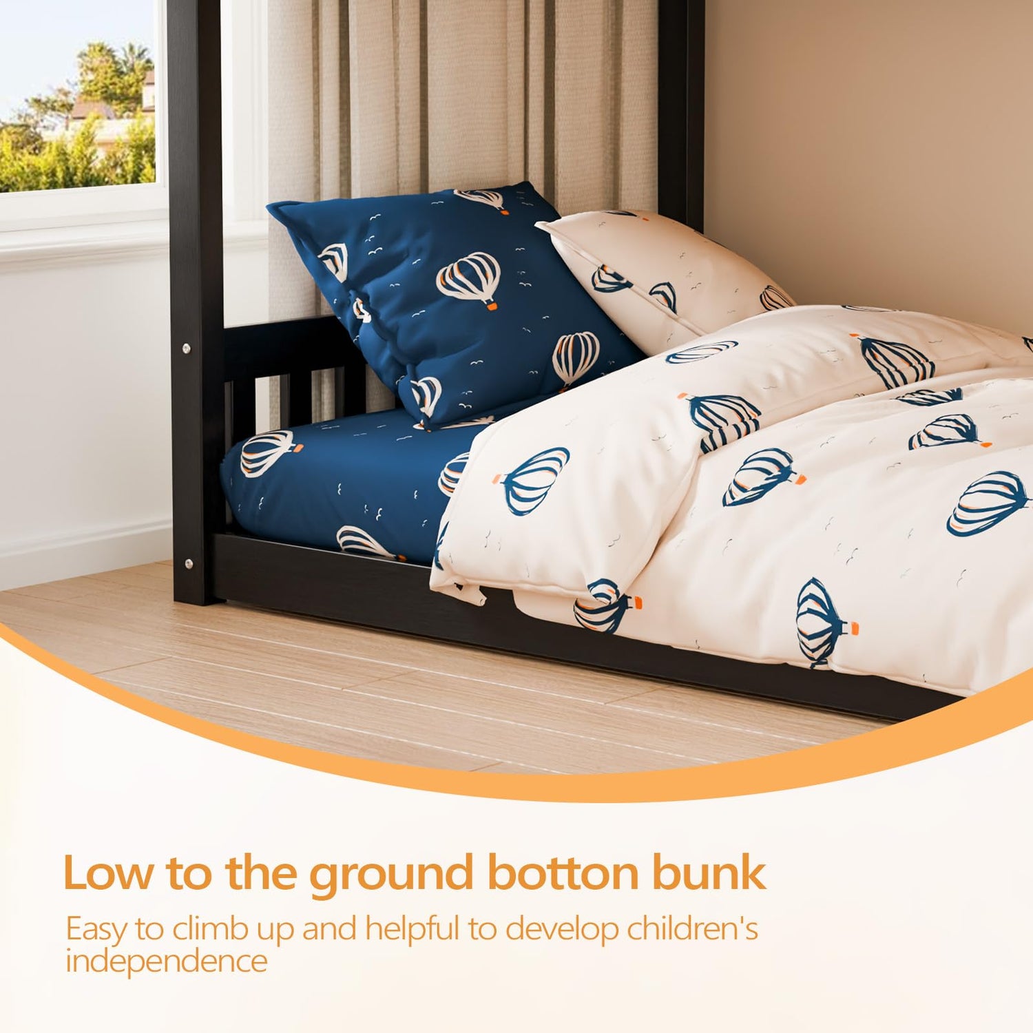 JOYMOR Solid Wood Low Twin Over Twin Bunk Bed for Kids/Junior, Bunk Bed Frame with Guardrails & Ladder for Boys Girls, No Box Spring Needed (Black)