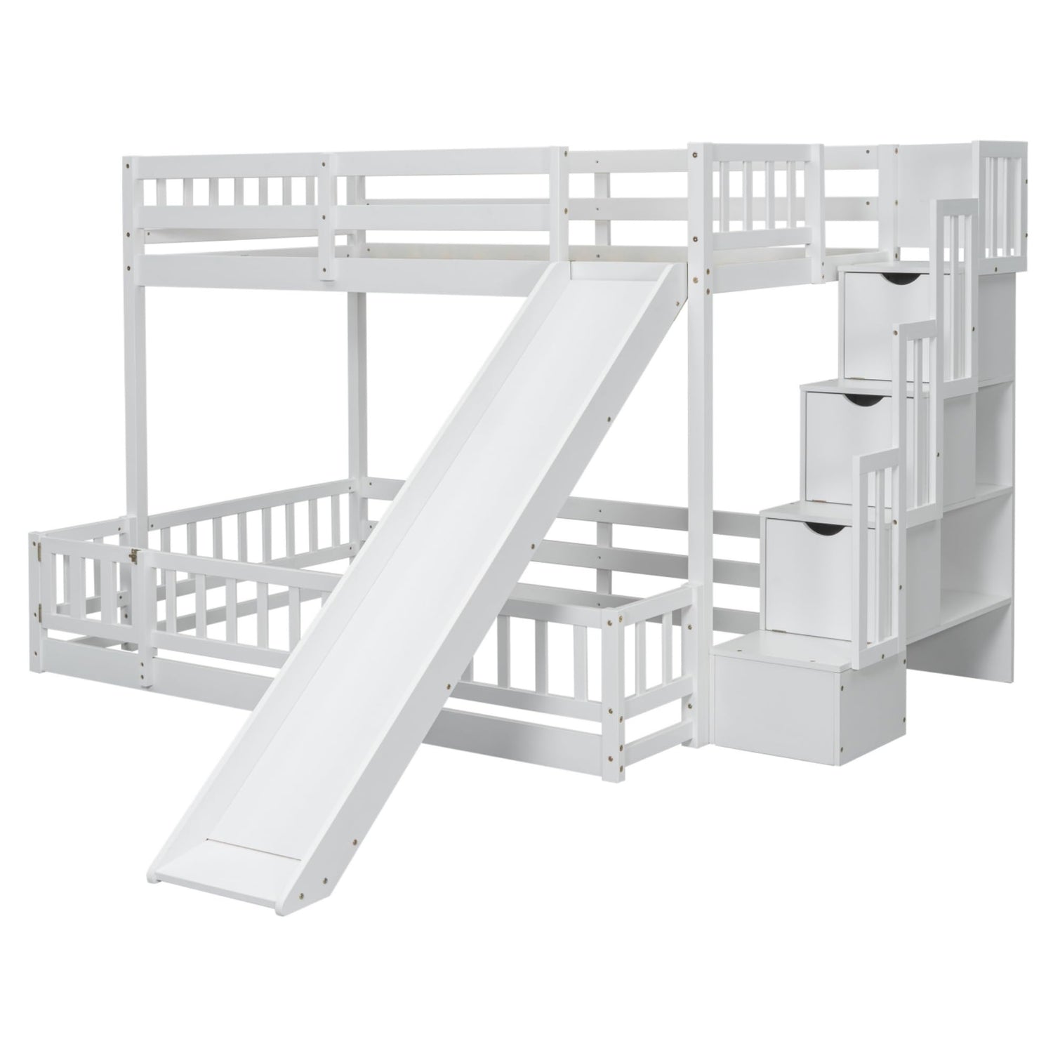 - [Space-saving Storage] Our bunk bed with slide comes with a convenient storage staircase, offering ample space to keep toys and books organized and out of sight. This thoughtful design helps maintain a clean and tidy bedroom environment. The sturdy staircase also features handrails for added safety and ease of use.