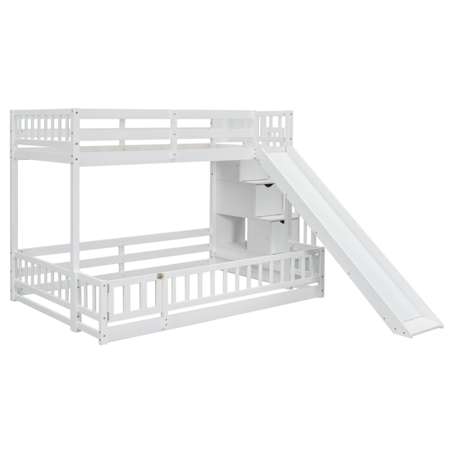 - [Unique Bunk Bed with Slide] Our twin over full bunk fed with slide offers a unique feature that allows for two individual, spacious sleeping spaces. The upper twin bed and floor full bed are equipped with guardrails to ensure safety while providing maximum comfort. Additionally, the built-in slide adds an element of fun to the bed.