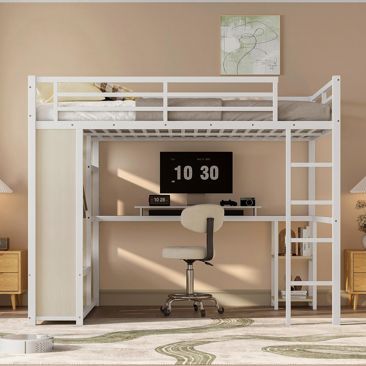 KEIKI Queen Size Loft Bed Frame with Built-in Wardrobe, Metal Loft Bed with Desk, Storage Shelves, Hanging Rod, Guardrail and Ladder, Noise Reduced BedFrame for Teens and Adults, White Wood-Grain