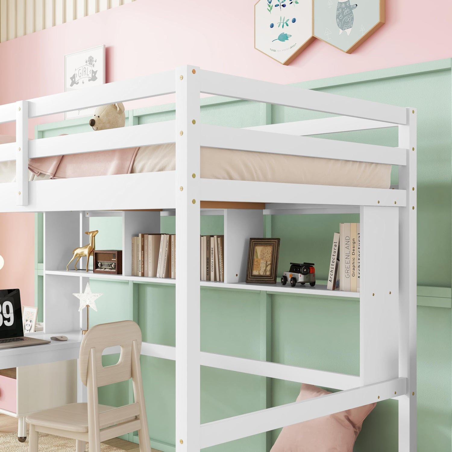 Details: Description: The loft bed combines bedroom and study into a cozy and lovely space, below the upper bunk there is a built-in desk, and a bookcase to do homework and get books and daily items.