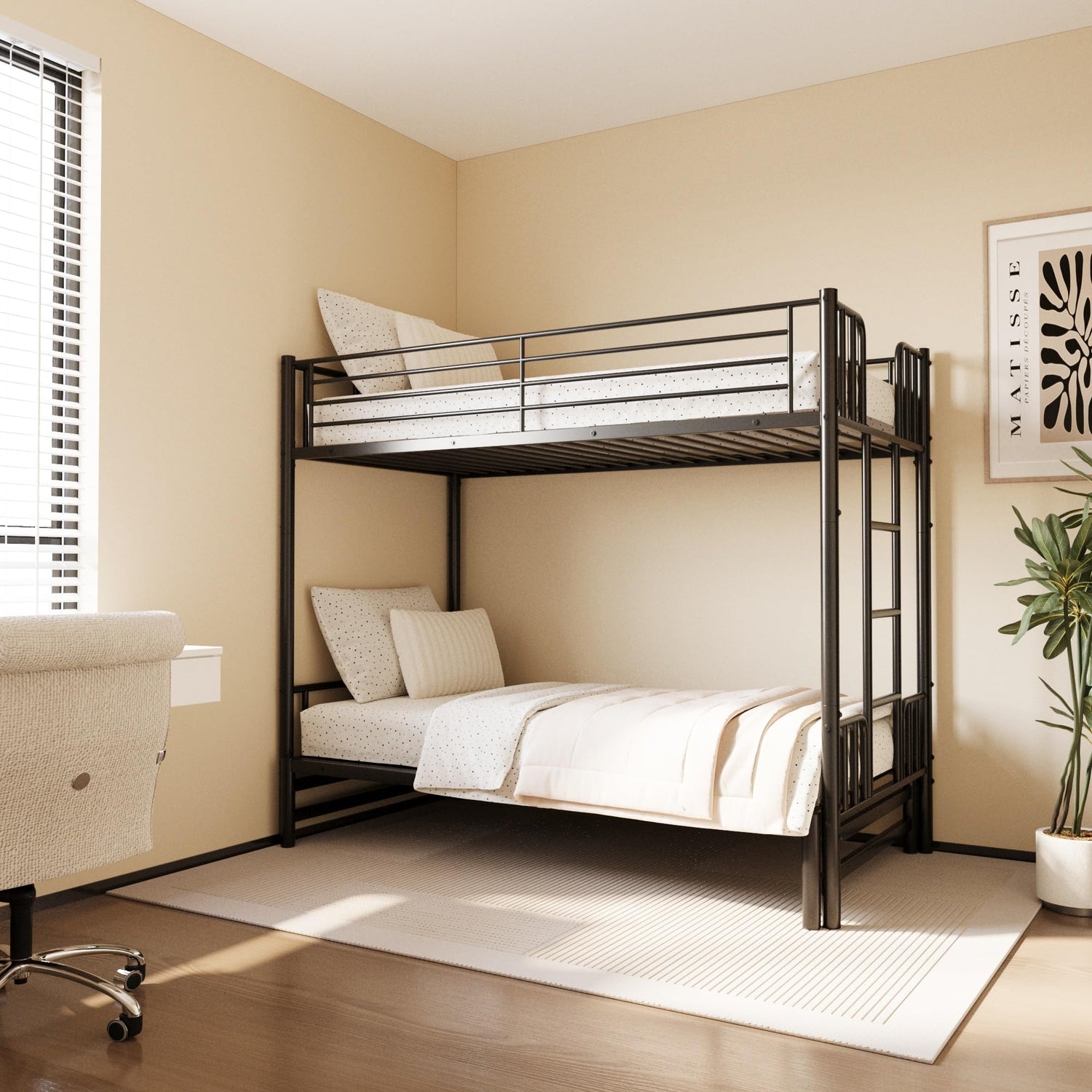 • Durable & Sturdy Construction: Built with a heavy-duty metal slat system, this bunk bed supports up to 350 lbs per bed, ensuring long-lasting durability and stability.