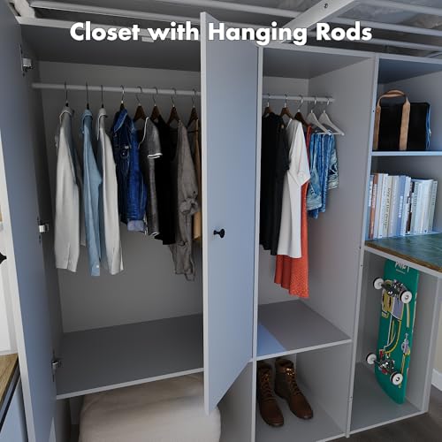 Kikihouse Full Size Loft Bed with Desk, Stairs & LED Light, Metal Gaming Loft Bed Frame with Headboard, Safety Guardrails, Charging Station, Closet and 12 Fabric Drawers, Space Saving, White and Oak