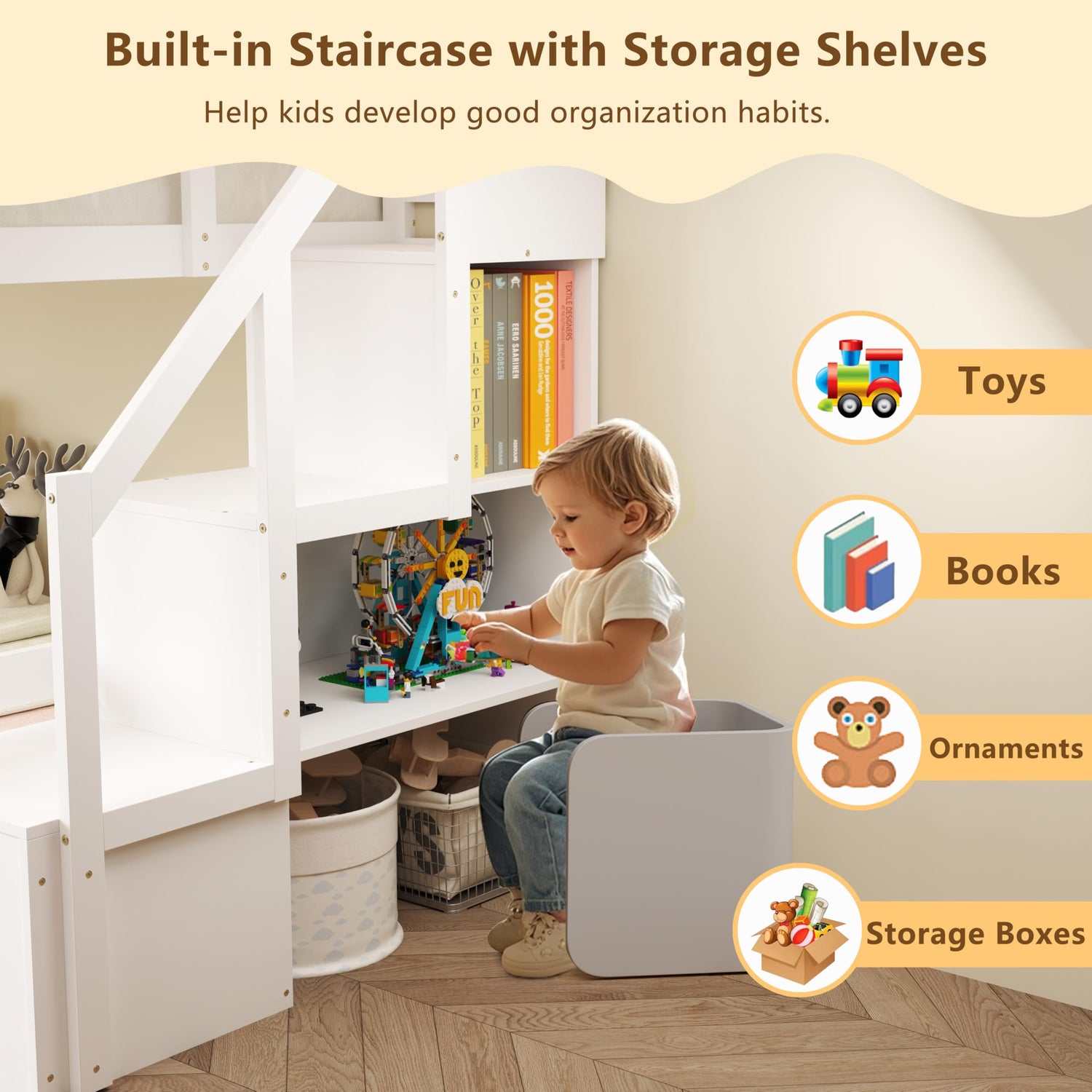 - 3-Step Staircase with Storage: The twin size bunk bed features a 3-step integrated stairway that provides easy access to the upper bunk. The staircase includes storage shelves, offering ample space for toys, books, snacks, storage boxes, and other essentials.