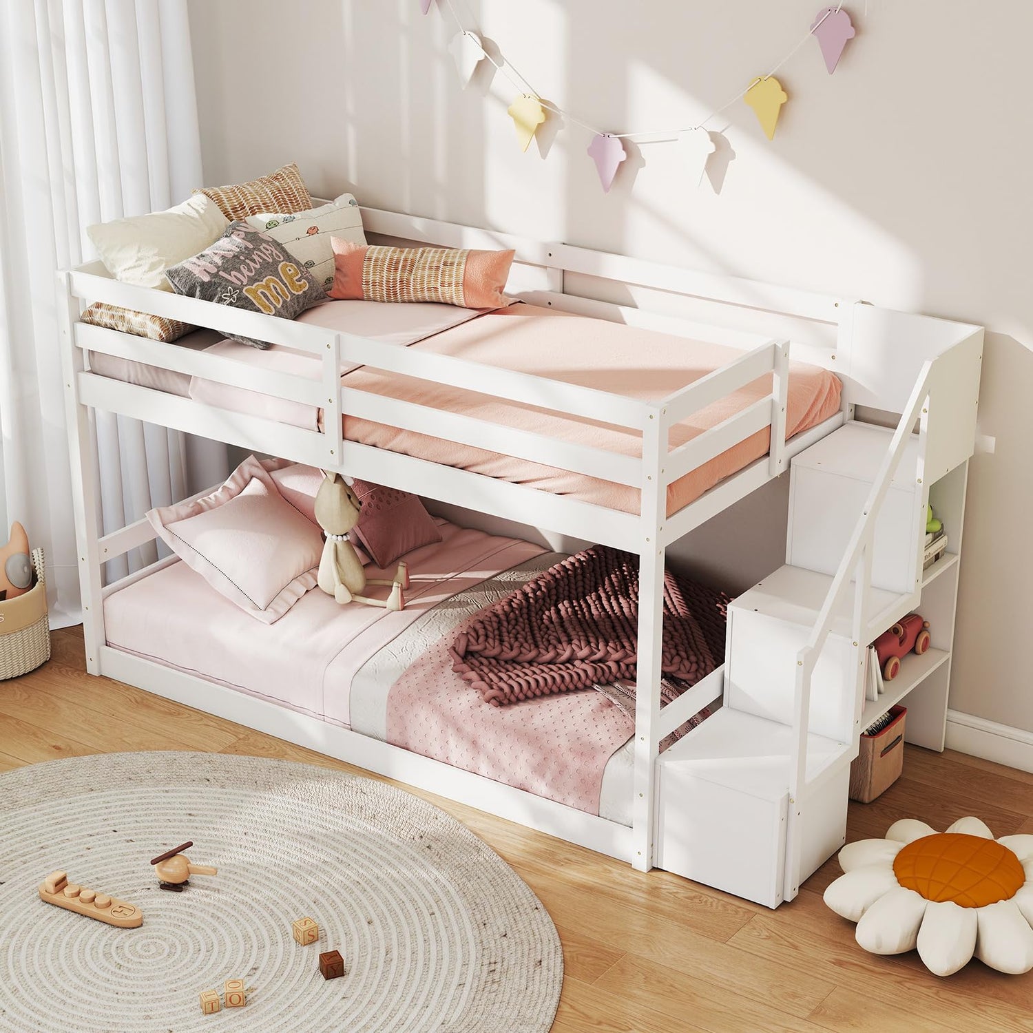 Crafted from solid wood with reinforced screw connections for durability and stability, this bunk bed supports up to 200 lbs per bed. The integrated 3-step staircase not only provides easy access to the top bunk but also includes storage shelves to keep essentials like toys, books, and snacks neatly organized. Safety is a priority with 12.5" guardrails and wide steps with handrails, ensuring a secure climb. The low profile design makes it ideal for younger children, while 14+7 plywood slats offer excellent mattress support without needing a box spring. Perfect for shared rooms or guest spaces, this space-saving bunk bed blends functionality with modern style to fit any decor.