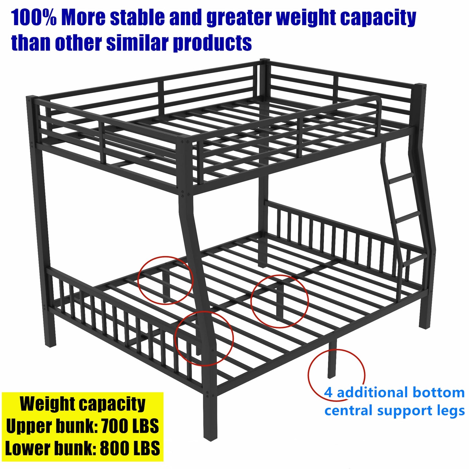 - Unique industrial style --- Classic black metal frame, which fully shows the modern industrial style. The heightened guardrails and reinforced ladder will provide you with more safety protection. Bunk Twin XL/Queen: Dimension: 82.7" x 63" x 65.6"H, Upper Bed Requires XL Twin Mattress: 39"W x 80"L. Bunk Full XL/Queen: Dimension: 82.7" x 63" x 65.6"H, Upper Bed Requires XL Full Mattress: 54"W x 80"L. Bunk Queen/Queen: Dimension: 83" x 63" x 65"H.(Mattresses are not included).