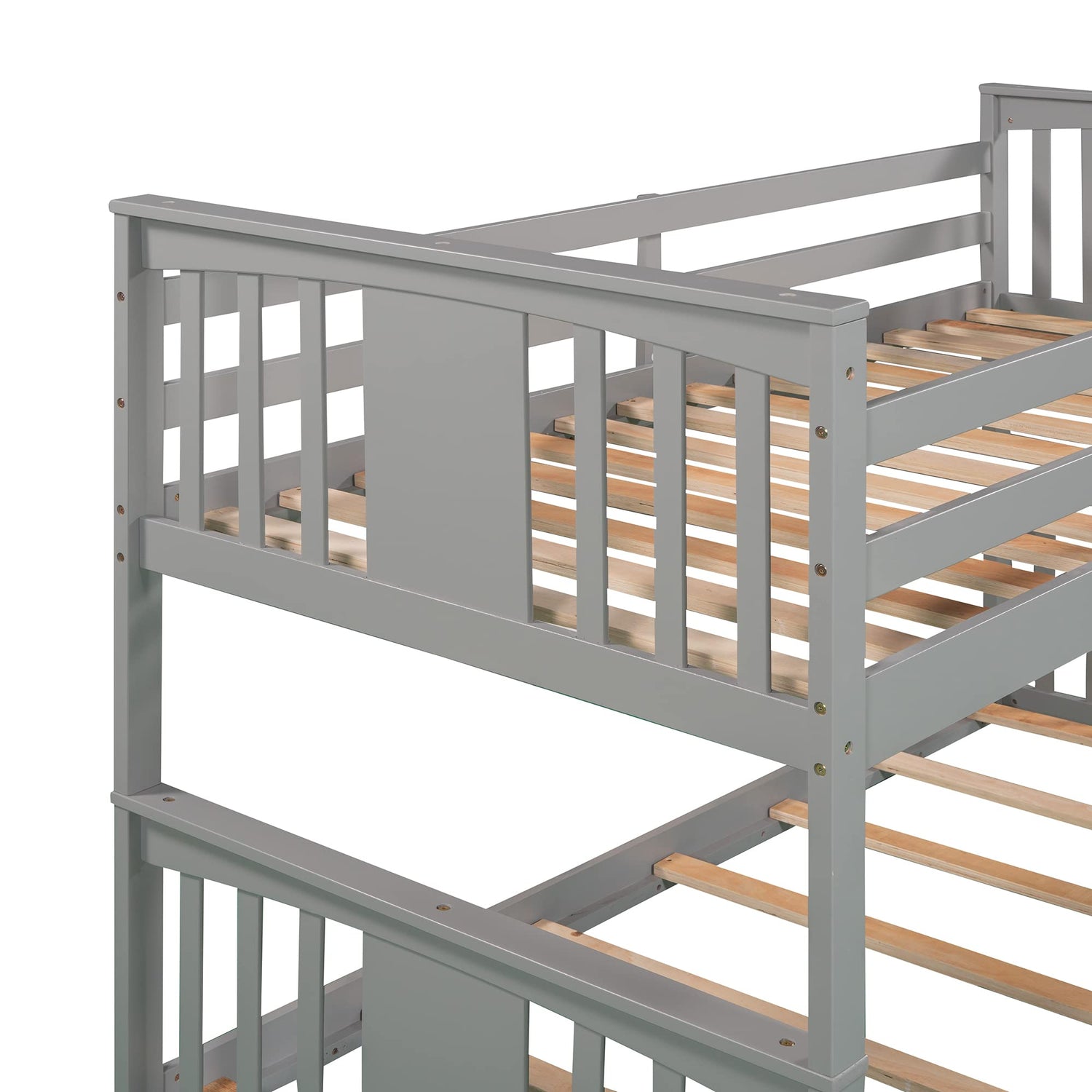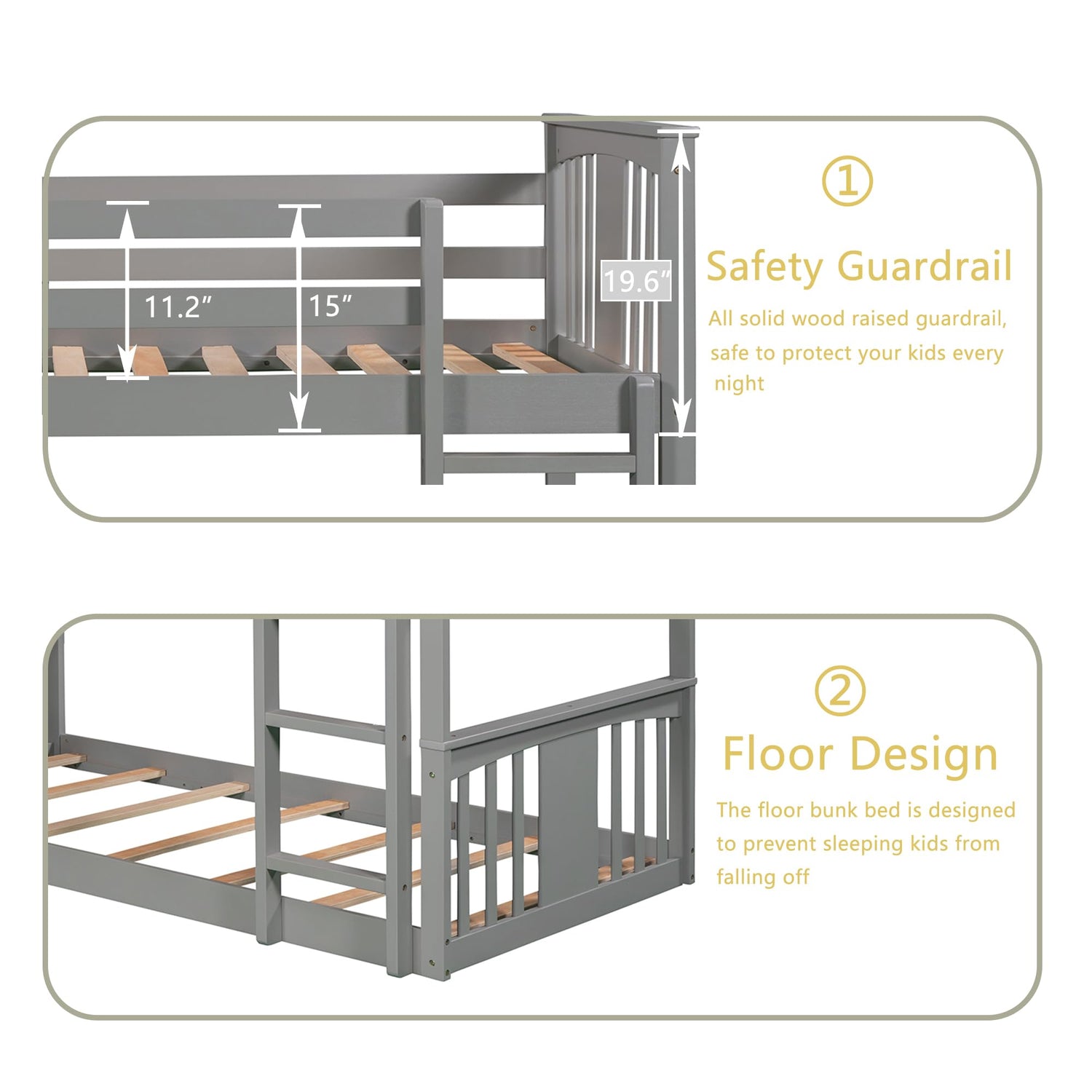 Low Bunk Bed Twin Over Twin, Twin Over Twin Bunk Bed with Ladder, Kids Bunk Beds with Full Length Guardrail, Montessori Floor Bunk Beds for Kids, Boys,Girls, Gray Bunk Bed Twin Size