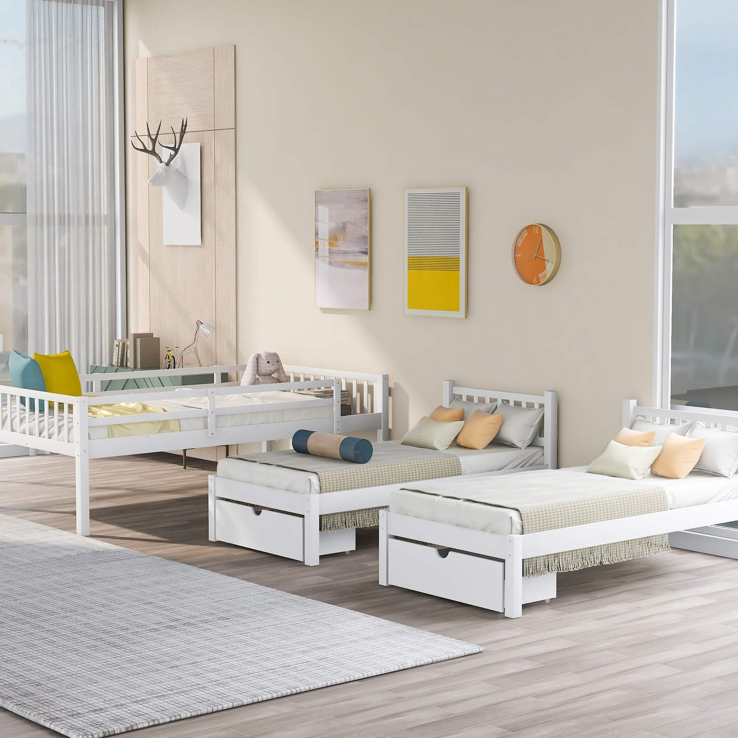 - v [Multi-functional] This triple bed can be divided into three separate beds to meet your different needs. The shelf beside the upper full bed and the table with drawer between the two lower beds provide place for you to put some daily supplies within easy reach, and the two pull-out drawers under the lower beds save a space for you to store some clothes and toys