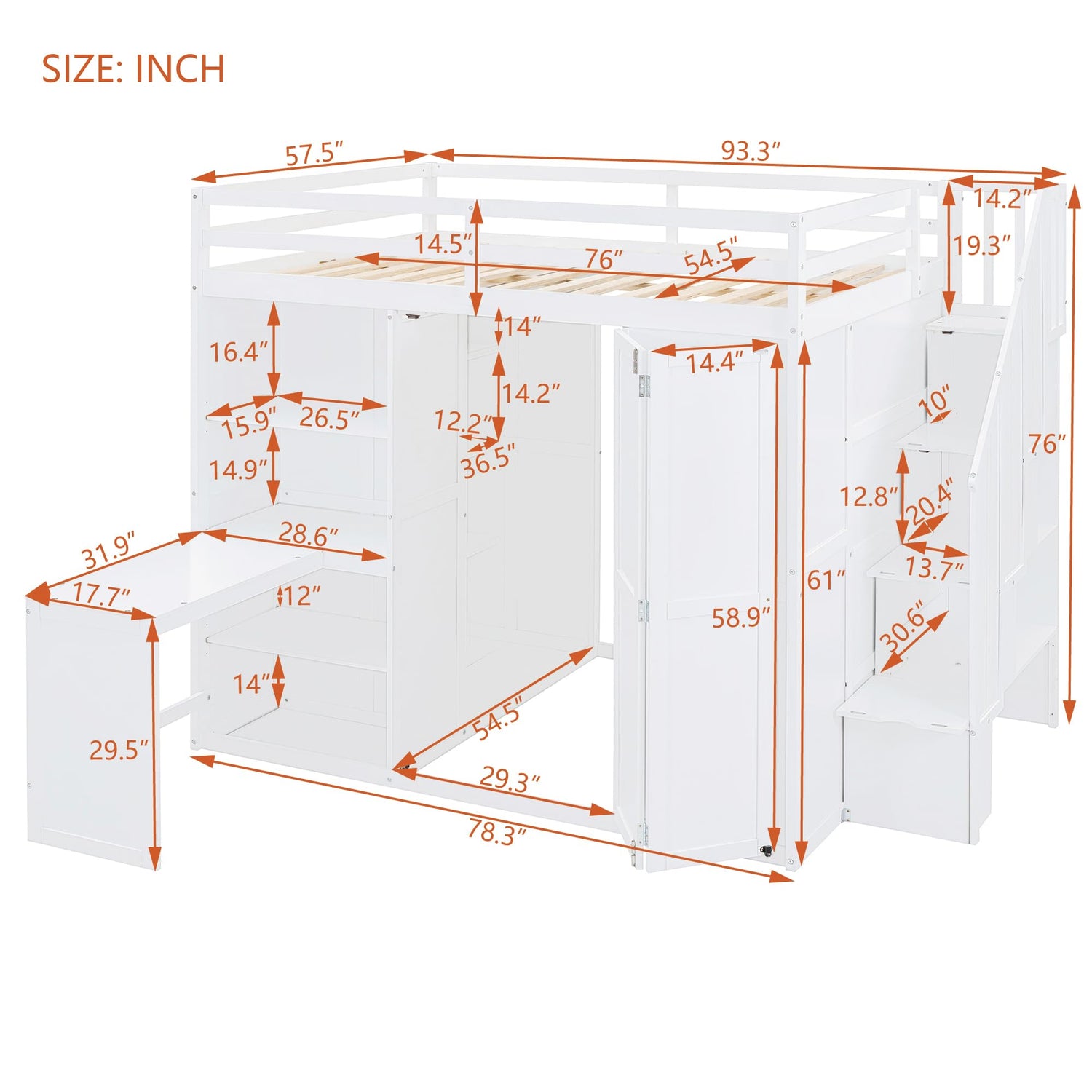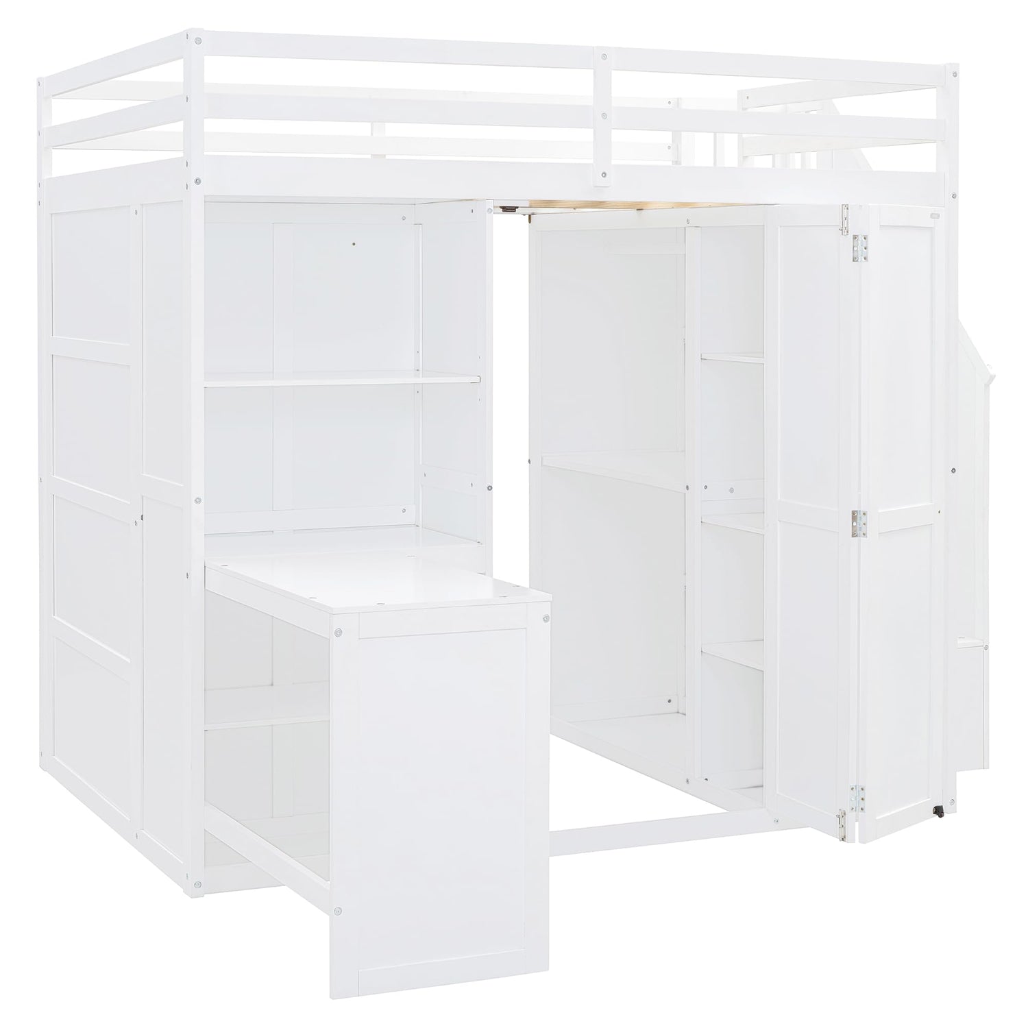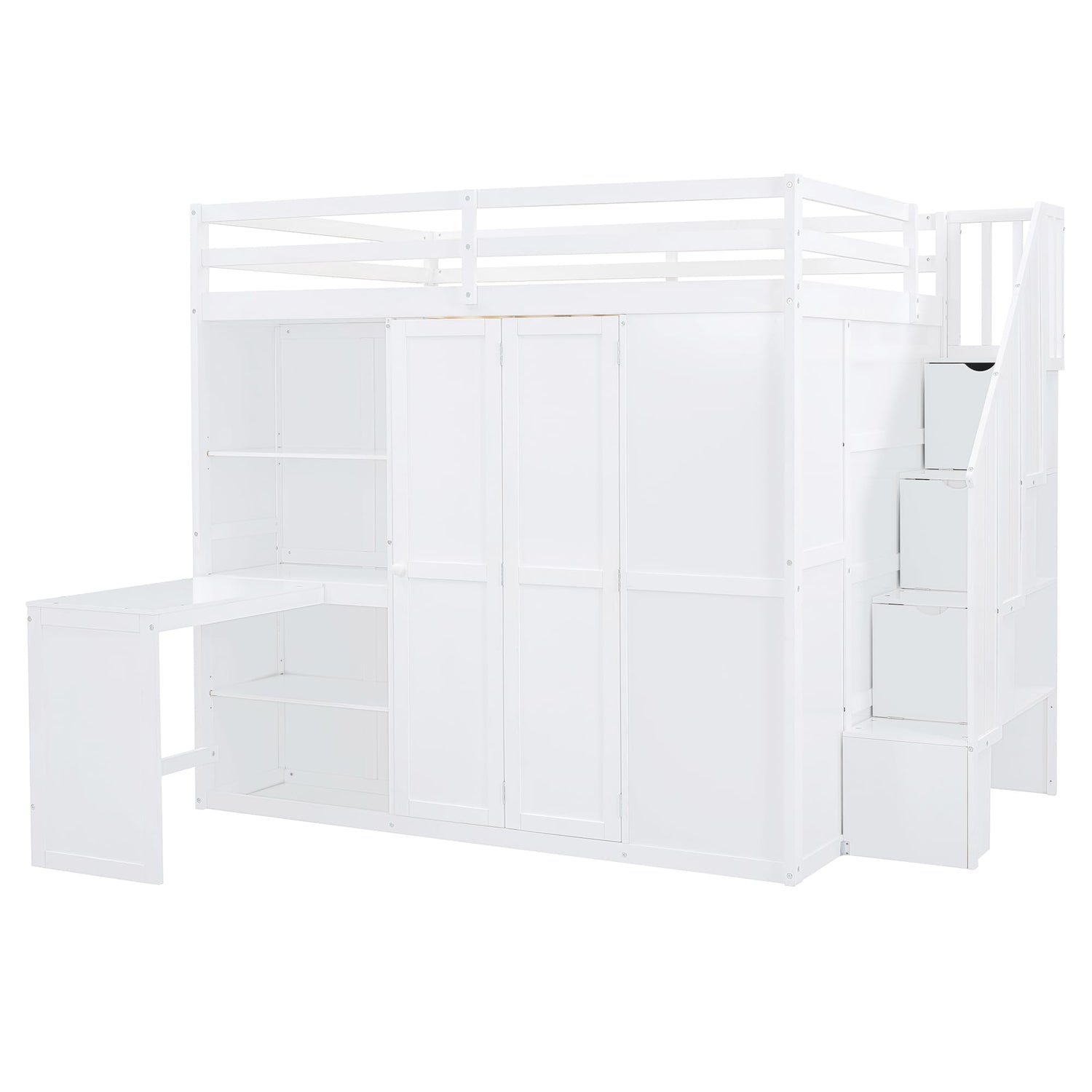 Merax Full Size Loft Bed, Wood Bedframe with Wardrobe, Storage Stairs, Desk and Shelves for Kids Teens Adults Bedroom, White