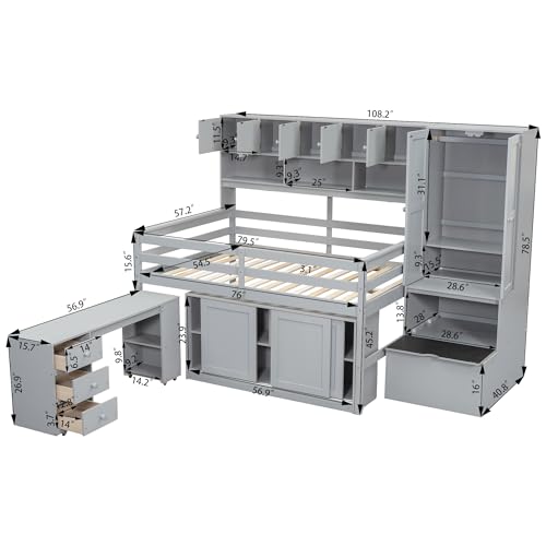 Merax Full Size Wood Loft Bed with Under-Bed Desk and A Big Storage, Storage Staircase,Drawers, Shelves, Integrated Wardrobe,Mobile Workstation,Gray
