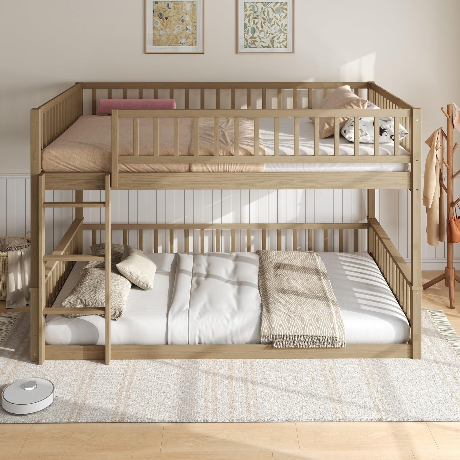 Merax Queen Over Queen Bunk Bed for Teens Adults, Wooden Floor Bunk Beds with Ladder and Guardrails for Guestroom Dormitory, No Box Spring Needed, Natural
