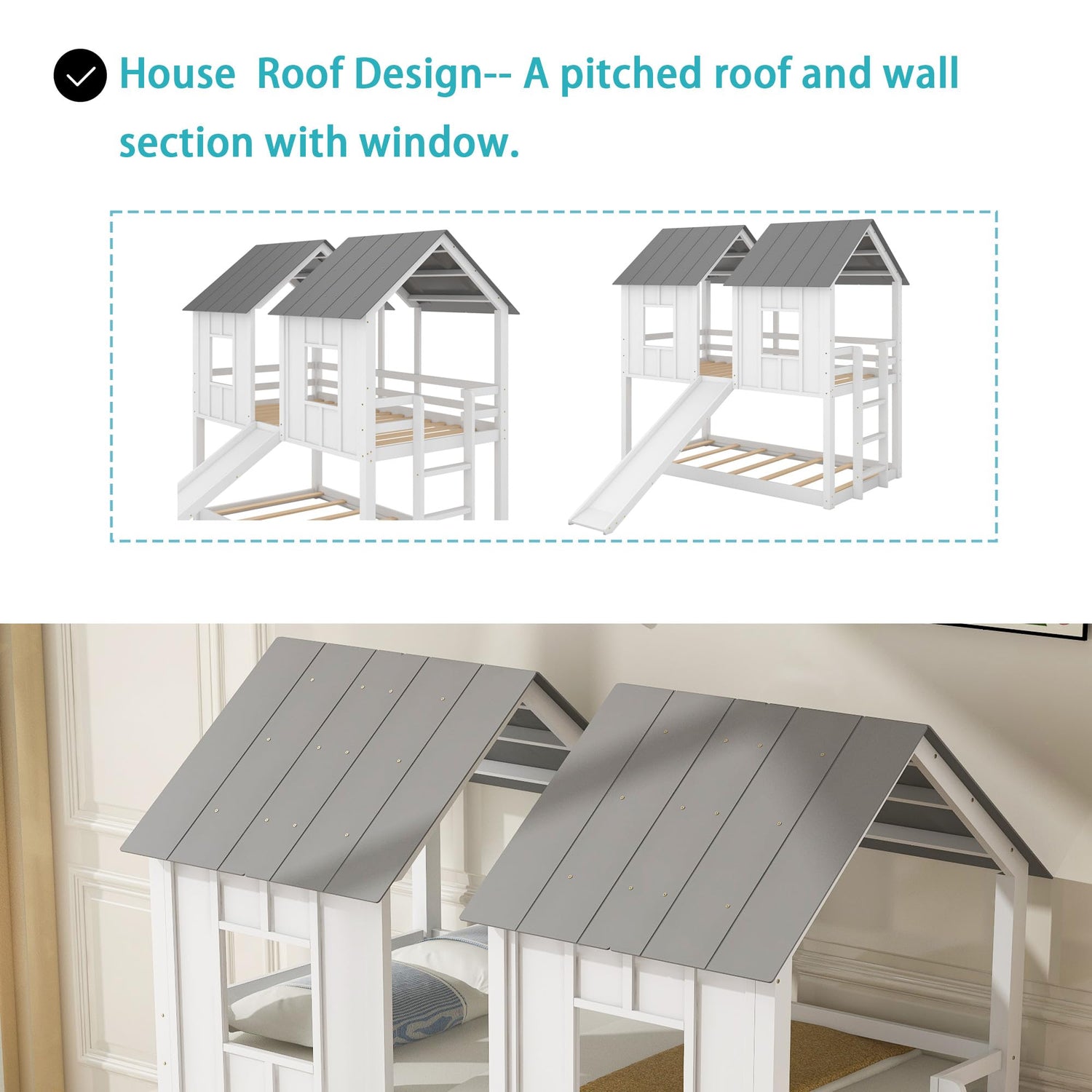 Merax Twin-Over-Twin Wooden House Bunk Bed with Slide, Windows, Ladder and Guardrails, Twin Size White House Bunk Bed