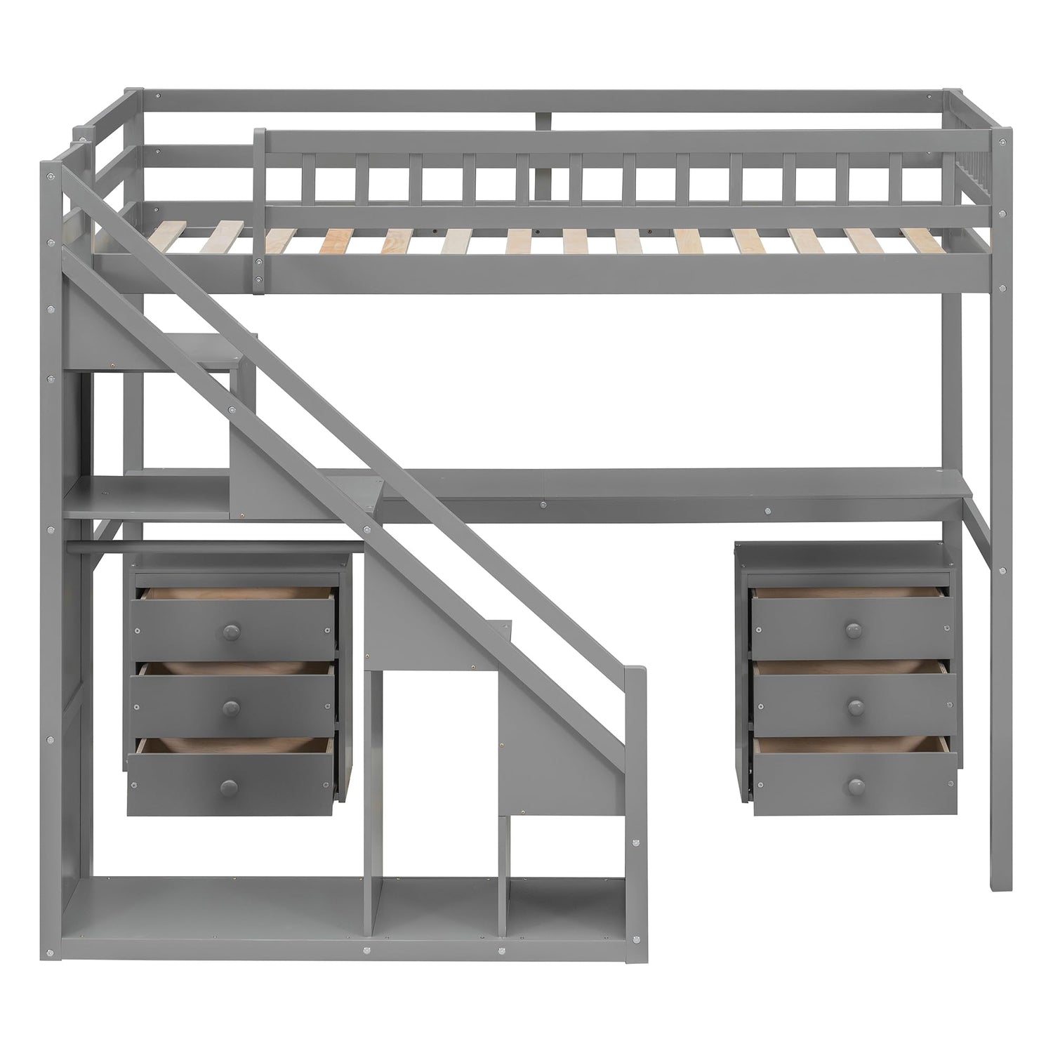 Merax Twin Size Wood Loft Bed with Desk, Stairs & Storage, Space Saving Bed with Lights, 2 Drawers, Guardrails, 220LBS Capacity, Gray