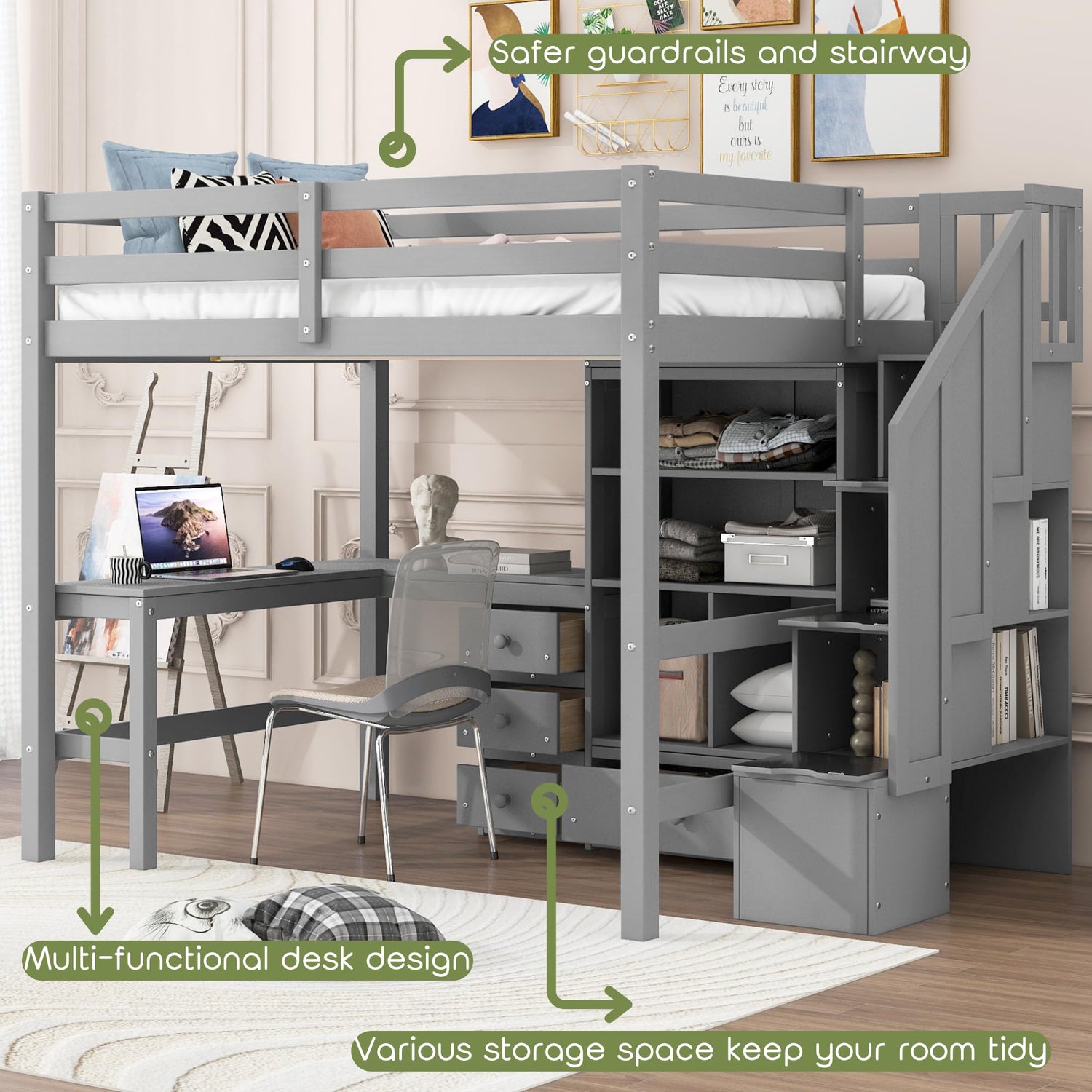 • 【Full Loft Bed with Desk and Storage】The full loft bed frame provides an excellent solution for rooms with limited space. The loft bed with desk underneath allows for a designated area to study, read, or play. With four shelves and four drawers for additional storage, this design helps keep the room organized and clutter-free. The clever use of space underneath the bed creates an ideal lounge or working area