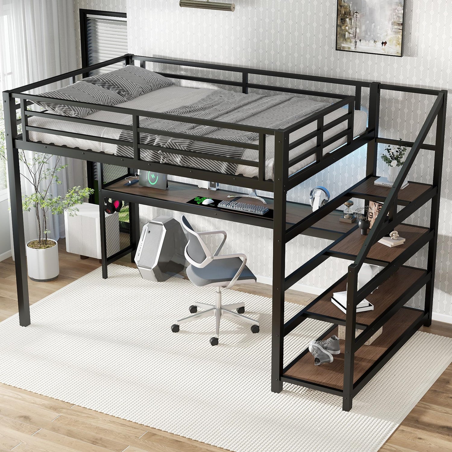 Metal Full Size Loft Bed with Desk and Storage Stairs,Heavy Duty Loft Bed Frame Full Size with LED Lights and Charging Station for Kids,Teens,Adults,Black