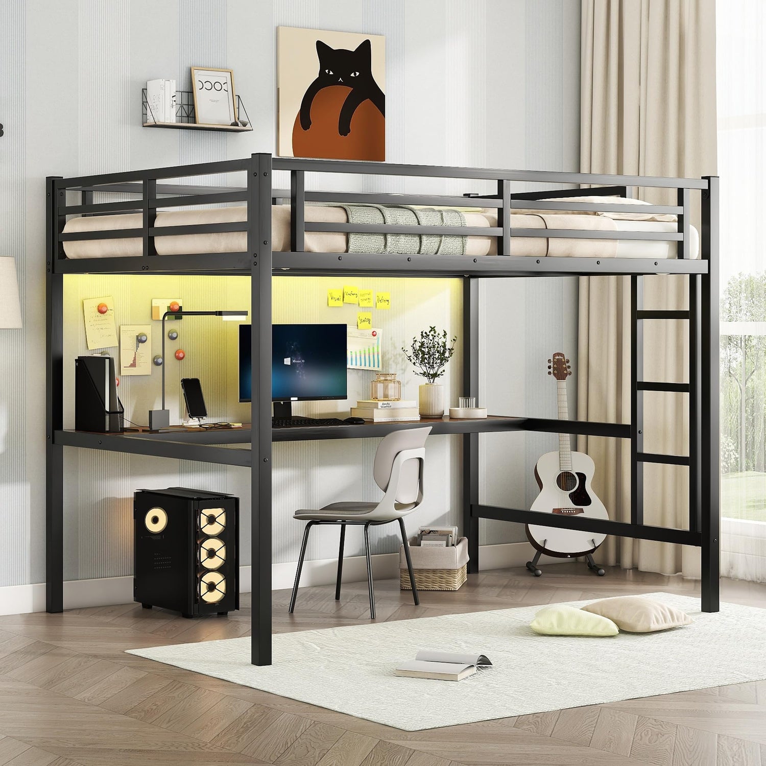 Metal Full Size Loft Bed with L-Shaped Desk, Loft Bed Full Size with Power Outlet and LED Lighted, Heavy Duty Metal High Loft Bedframe, Safety Guard & Ladder, Space-Saving, Noise Reduced, Black