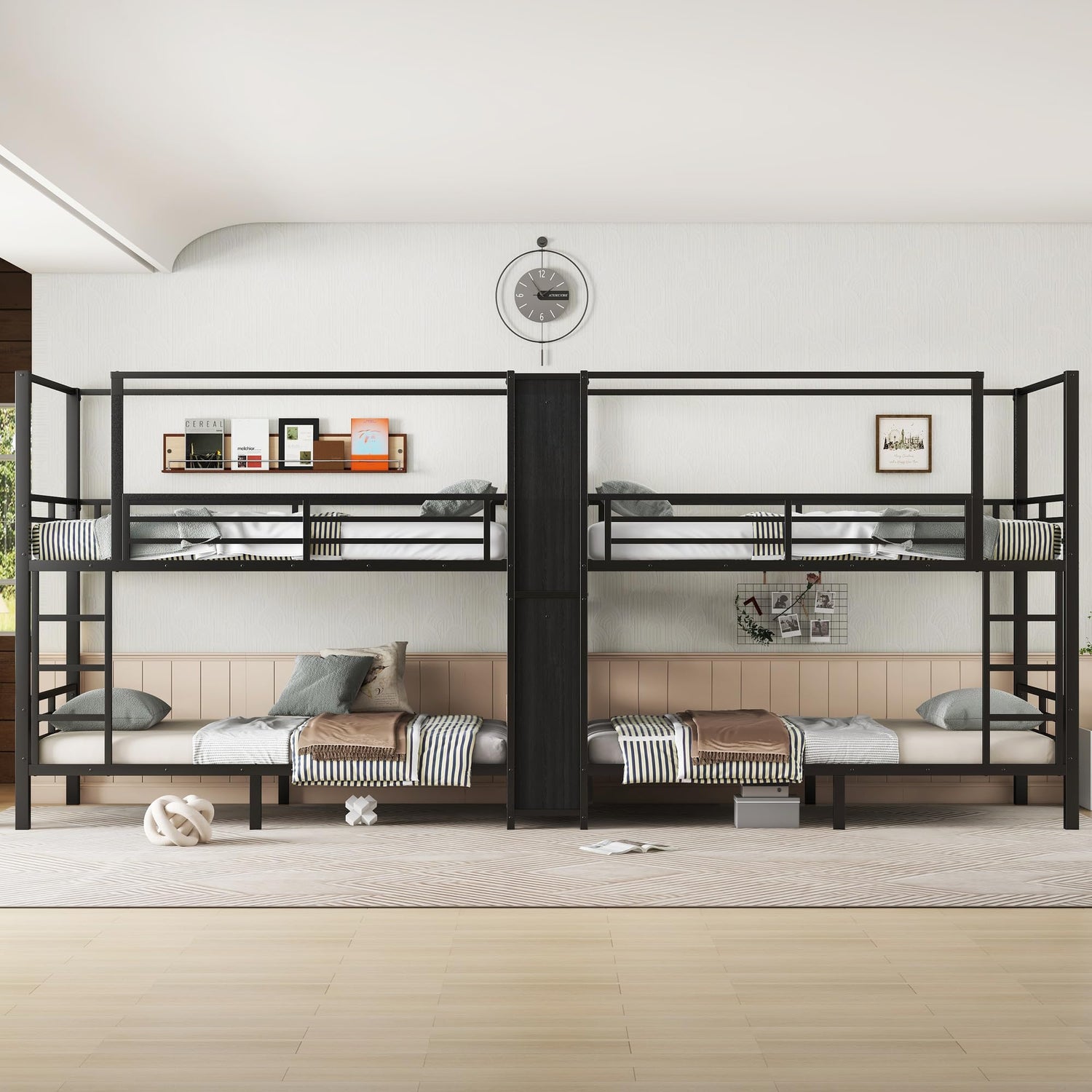 Details: This Quadruple Metal Bunk Bed connected together in the middle by a central closet and storage shelves, clothing can be stacked or hung up, and the middle partition can also hold books and other items, making great use of limited space. Suitable for a wide range of both functionality and durability.