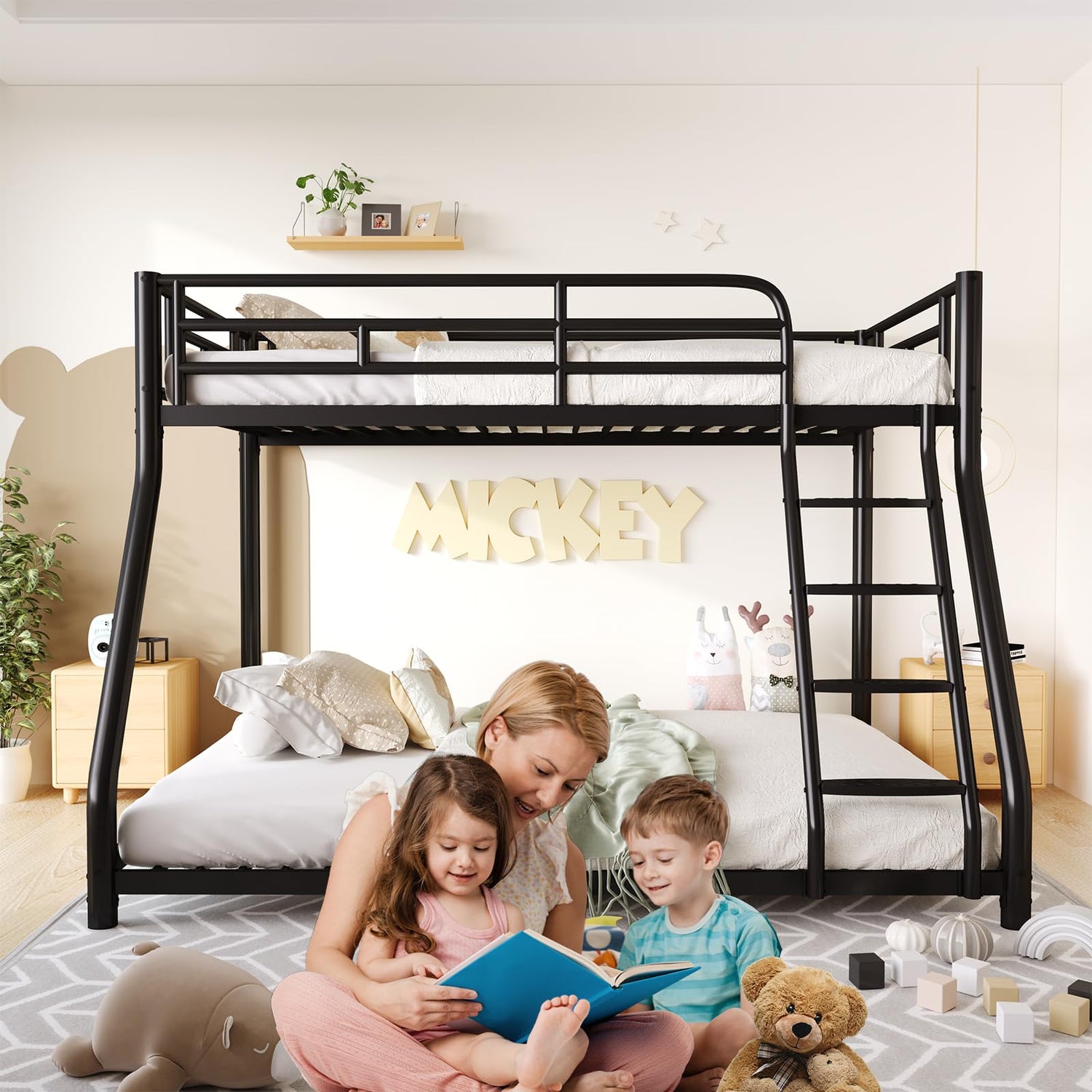 - 【Easy Climbing Features】: Bunk Bed Twin Over Full Size Designed with child safety in mind, the Metal Bunk Bed features an external ladder with an inclined design, making it easy for kids to climb. The wide steps and smooth circular handrails can protect them from any harm when they reach the upper bunk.