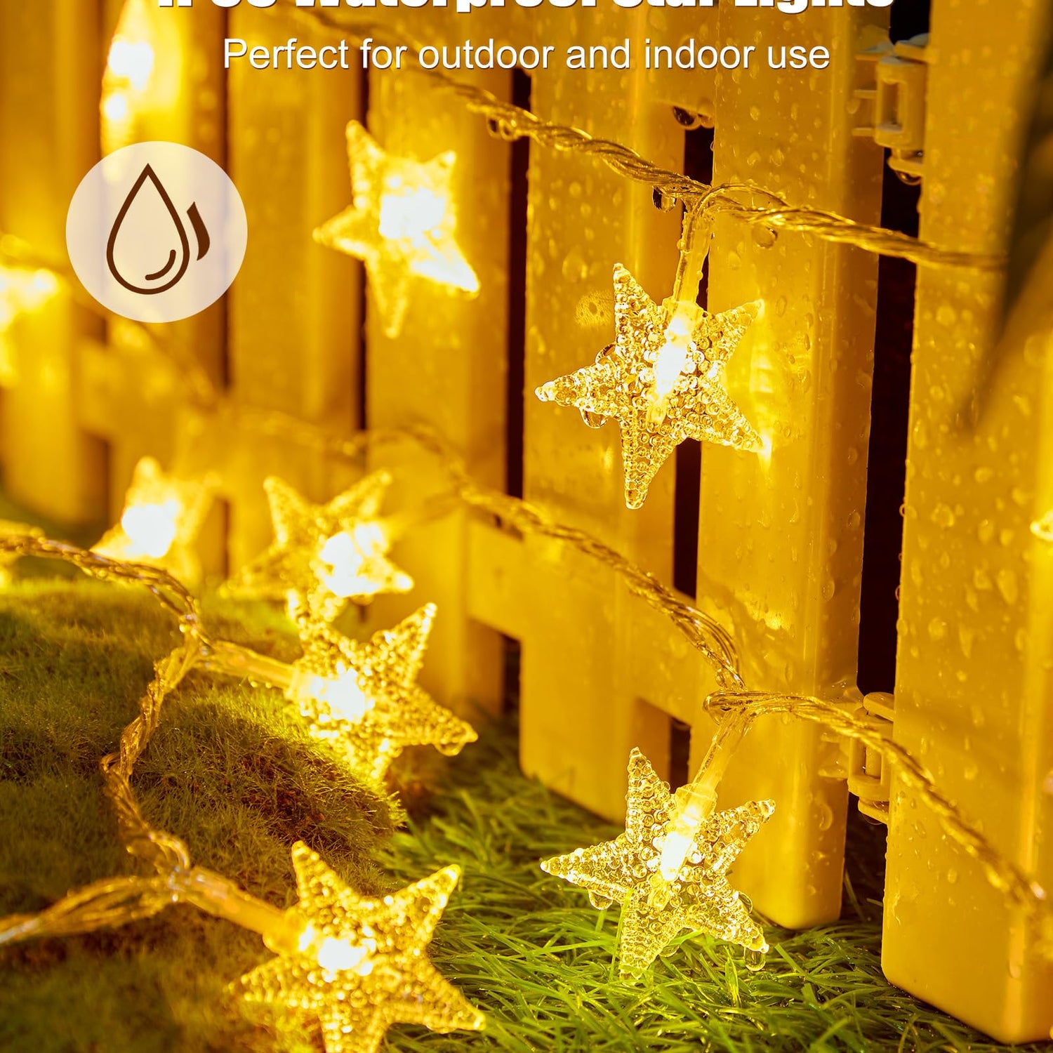 - 【 Battery Star String Lights 】- Powered by 3 × AA batteries ( not included ), the star fairy string lights are 17 feet long with 50 bright LEDs. The thin clear wiring and lovey star-shaped LED bulbs will add a delicate and romantic touch to your personal space. Each star bulb is about 1.3 inches wide with durable, waterproof plastic construction