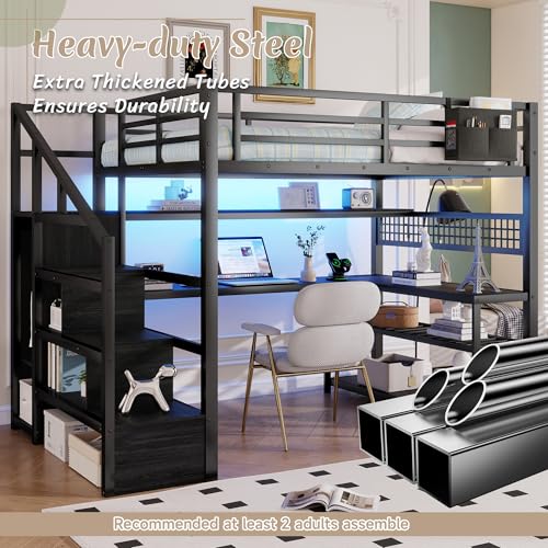 Mirightone Full Size Loft Bed with Desk & Stairs, Heavy-Duty Metal Loft Beds with Upper Shelves & Wardrobe, High Loft Bed Frame with LED and Charging Station for Boys, Girls and Teens (Black)
