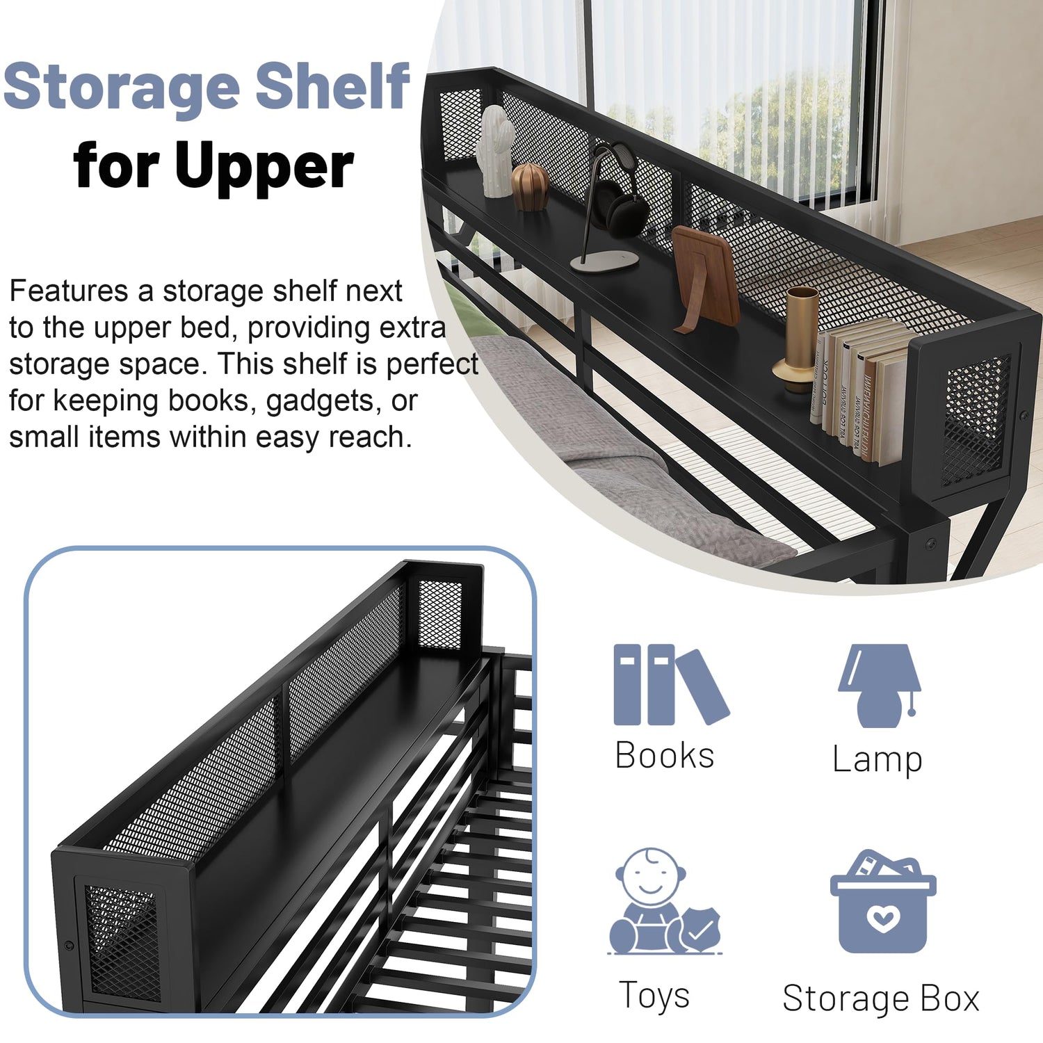 - 【Queen over Queen Bunk Bed with Storage Shelf】Our metal bunk bed queen over queen included the storage shelf on upper bed providing extra storage space. This shelf is perfect for keeping books, gadgets, or small items within easy reach. The shelf have mesh around which prevent thing falling down. It adds functionality without compromising space.