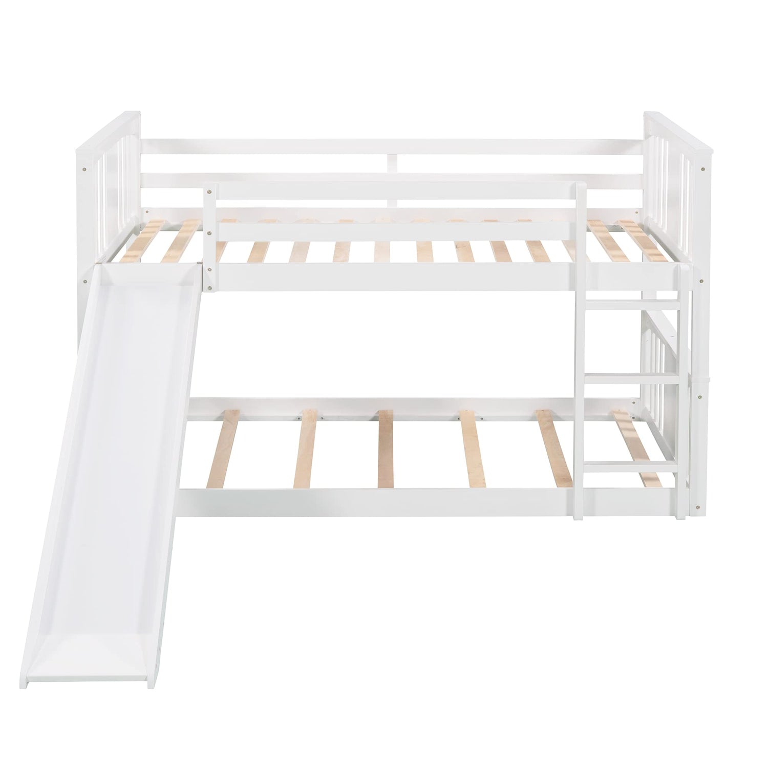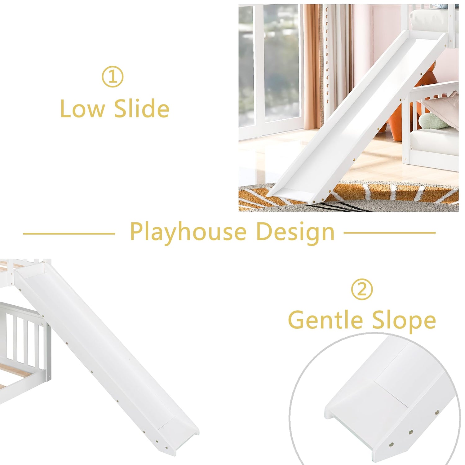 • đŸ„‡đŸ„‡ 【Twin Bunk Bed with Slide: Playhouse Design】This twin over twin bunk bed comes with a low slide, bringing extra fun for your kid’s bedroom. With built-in ladder, it is easy for you to climb up and down from the top bed. The smooth slide is also designed with a gentle slope, providing an added layer of safety. The slides and ladders are not convertible.